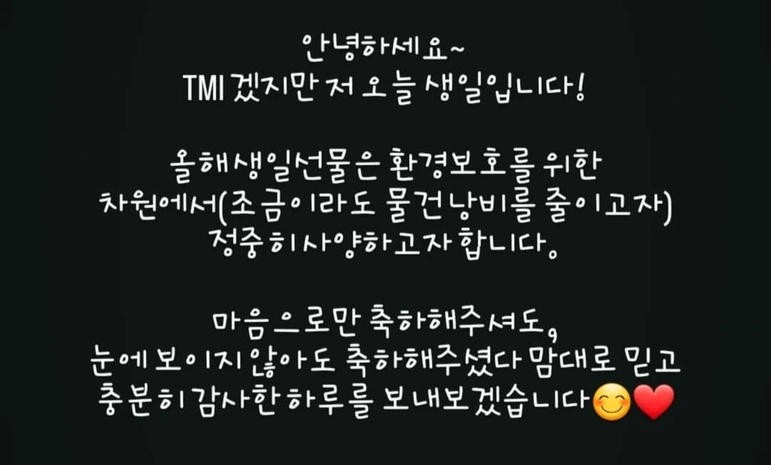 ‘생일 선물은 환경보호를 위해(조금이라도 물건 낭비를 줄이고자) 정중히 사양합니다. 마음으로만 축하해주셔도, 눈에 보이지 않아도 축하해주셨다 맘대로 믿고 충분히 감사한 하루를 보내보겠습니다.’