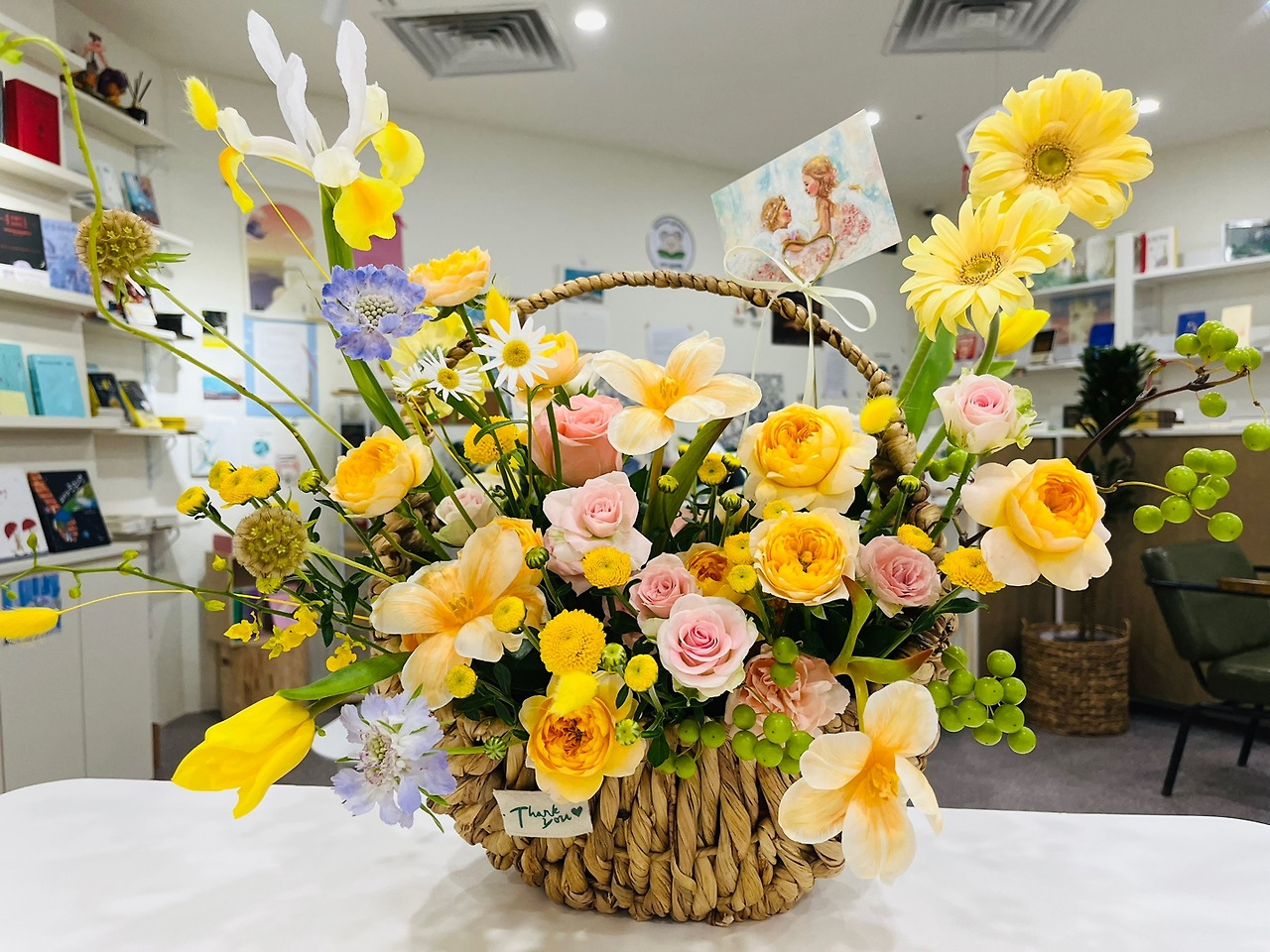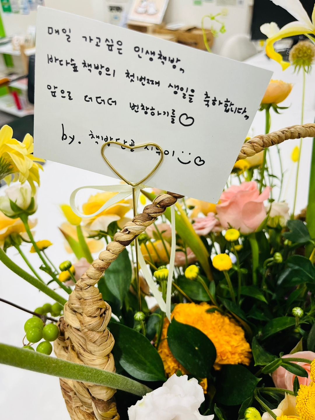 게다가 얼마 전, 서점 1주년을 축하하는 꽃바구니까지 보내왔다. 꽃바구니를 받는 것 자체가 처음이어서 그냥 받아도 감동이었을 텐데, 내가 인스타그램에 몇 번 언급했었던 근처 꽃가게를 기억해 두었다가 그 가게에 연락하여, 내가 좋아하는 노란색 꽃을 위주로 구성해 달라고 주문했다는 이야기를 꽃가게 사장님께 들었다. 거기다 나는 처음에 꽃바구니가 우연히 모임 시간에 온 건 줄 알았는데, 그조차 의도된 것이었다는 걸 듣고는 깜짝 놀랐다. 어떻게 이토록 세심하게 배려하고 생각하여, 완벽한 선물을 해줄 수 있을까. 하나의 선물에 얼마나 많은 마음이 담겨있는지 다시금 깨달으며, 선물을 받는 친구가 무엇을 받으면 좋아하고 기뻐할까 고민하는 과정에서 괴로워했던 나날이 떠올랐다. 그러다가 선물 주고받기를 포기해버리곤 했던 나 자신의 매정함에 대해 반성했다. 내가 선물할 때 이토록 진심이었던 적이 있던가, 이토록 성공적으로 진심을 전했던 적이 있던가!