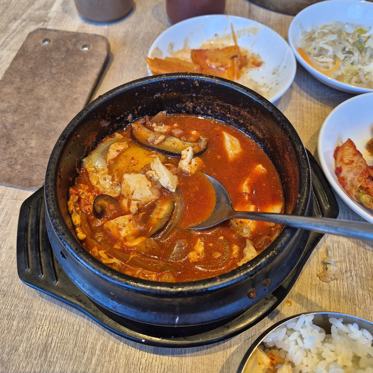 순두부찌개를 시켰다. 매운맛 조절도 가능하다고 한다. 6단계까지 있고 추가비용이 없는 5단계로 주문했다. 음식이 나오고, 한 술 떠보니 맵지 않았다. 뭐 맛이 얼마나 다르겠어 생각했지만, 맛은 다르지 않다. 순두부찌개가 맞다.