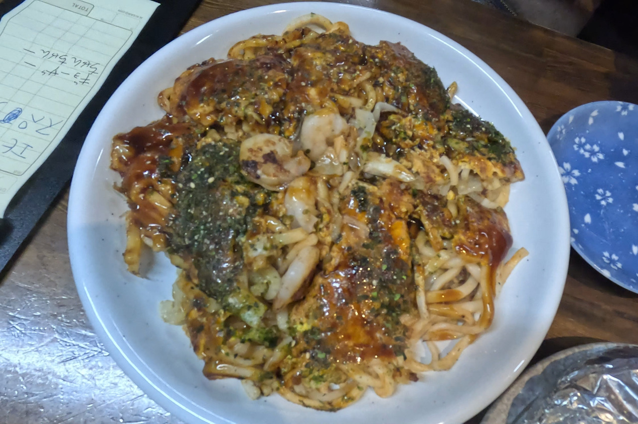 한 젓가락 뜨면서, 대학교에 다닐 적이 생각이 났다. 히로시마 풍의 오꼬노미야끼에는 소바 또는 우동면을 볶아서 양배추와 함께 계란 지단으로 덮는다. 오사카의 오꼬노미 야끼와는 다르다고 한다. 솔직히 잘 모르겠고 학교 앞에 있던 지지고라는 가게에서도 철판에 우동면과 채소를 달고 짜게 맛있게 볶아준다. 그리고 컵에 담아준다. 소스의 맛은 거의 비슷했다. 추억이 생각나는 맛이었다. 하지만 뭔가 허전한 느낌이 들었다. 첫 입은 아주 달고 맛있었다. 점점 진해지는 짠기는 어쩔 수 없었고, 음료나 맥주를 시키면 그만이니까.