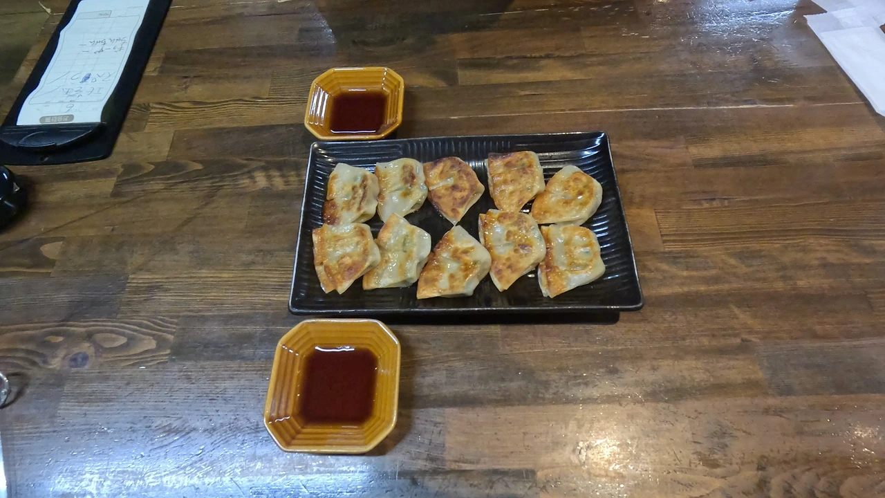 사이드 메뉴로 있던 만두와 연어조림, 만두가 한 입에 쏙 들어가고, 간도 적당하니 맛있었다. 연어 조림? 사케야끼는 소스와 버무려서 먹으라고 했는데, 섞는 순간부터 물을 들이킬 수밖에 없었다. 맛은 있지만 너무 짜고 달고 하하