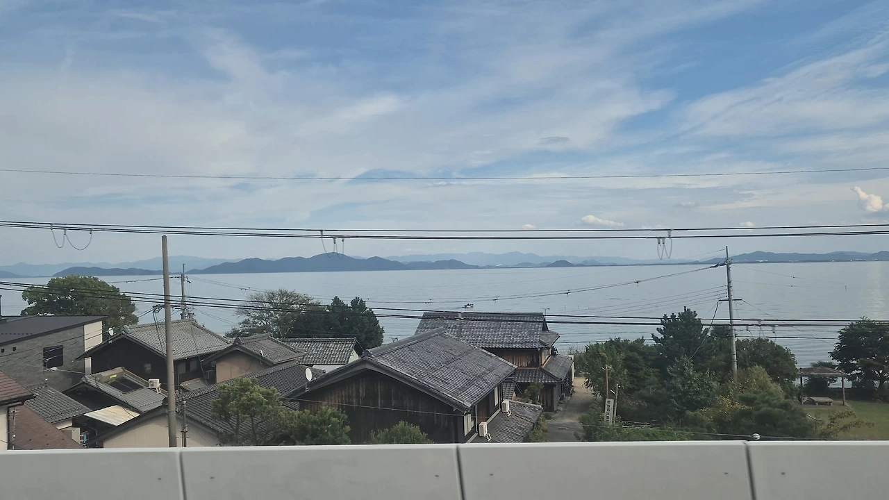 썬더버드는 교토를 거쳐 쓰루가로 향한다. 기차를 타고 밖을 보다 보면 일본에서 가장 큰 호수인 비와호를 볼 수 있다. 무조건 오른쪽 자리에 앉아야만 보인다. 호수라고 하는데 참돔, 광어가 잡힐 것 같은 아주 거대한 호수이다. 내려서 호수를 보고 싶다면 나가하마 역으로 가야 한다. 호쿠리쿠 본선에 있는 역이다. 바로 앞에서 호수를 볼 수 있다. 유람선을 타고 싶으면 오쓰로 가야 하고. 가면 미시간크루즈가 있다. 미시간주와 오쓰시가 자매 협정이라고 하나 뭐래나. 둘 다 여자구나? 아무튼...