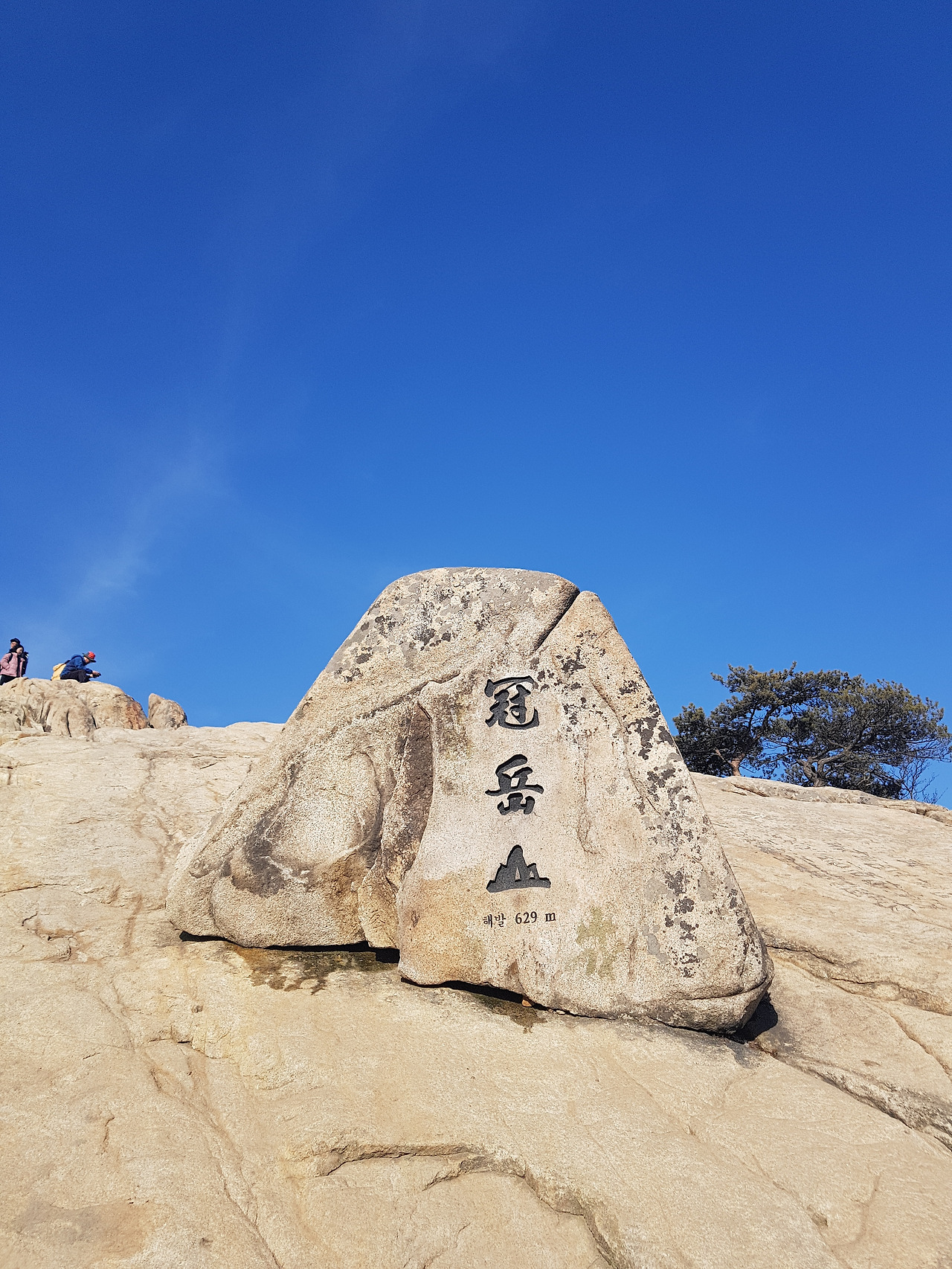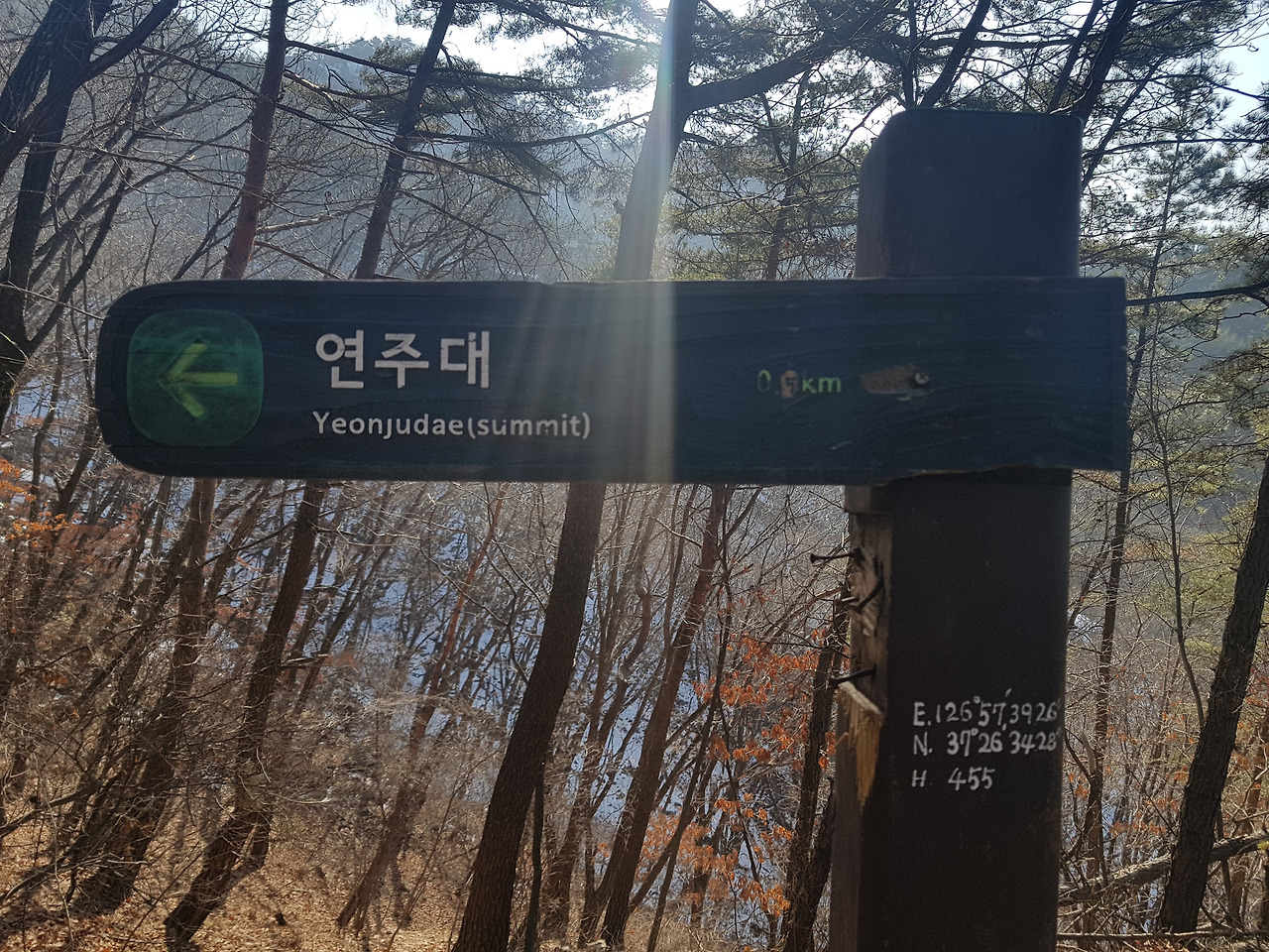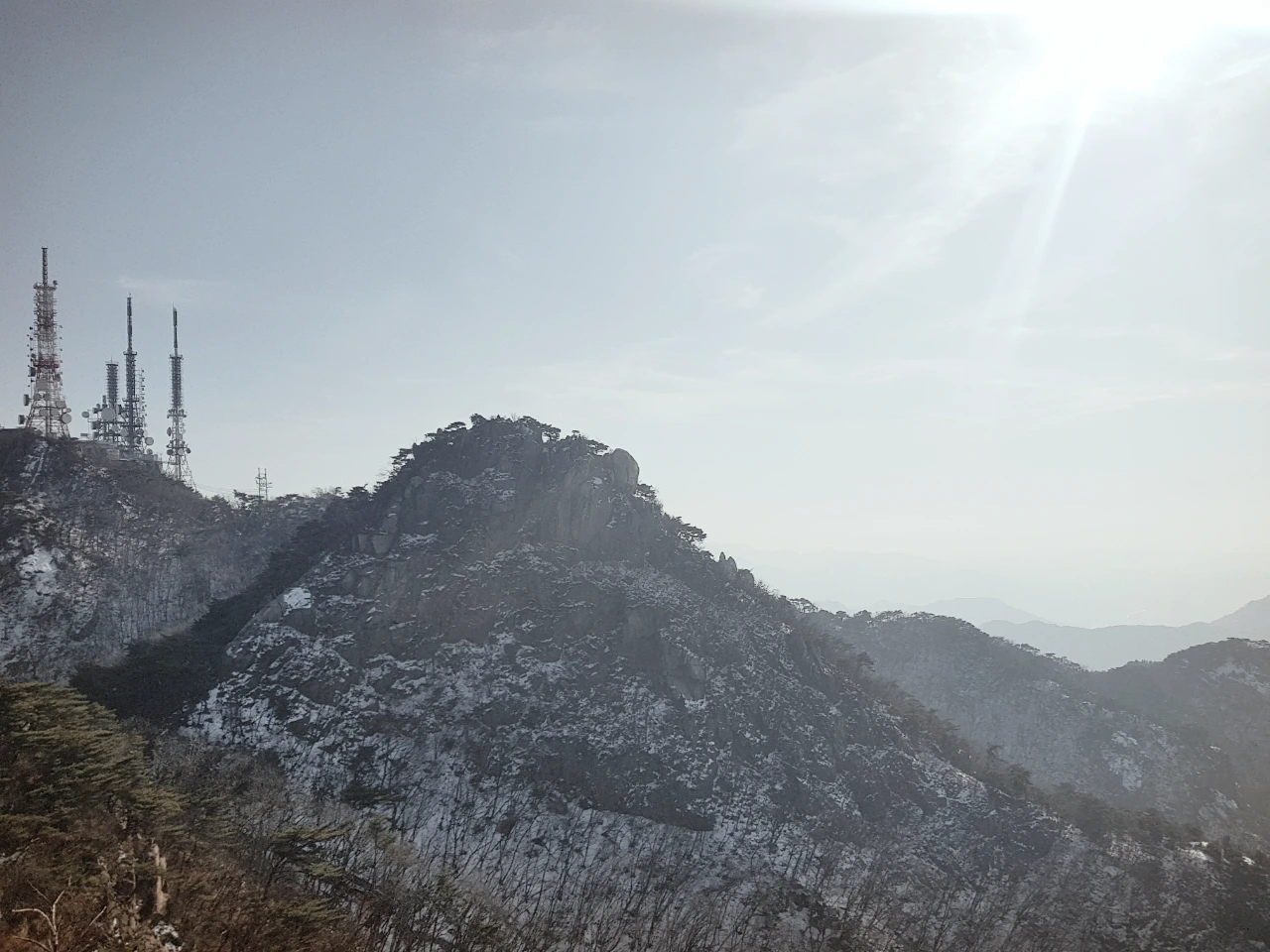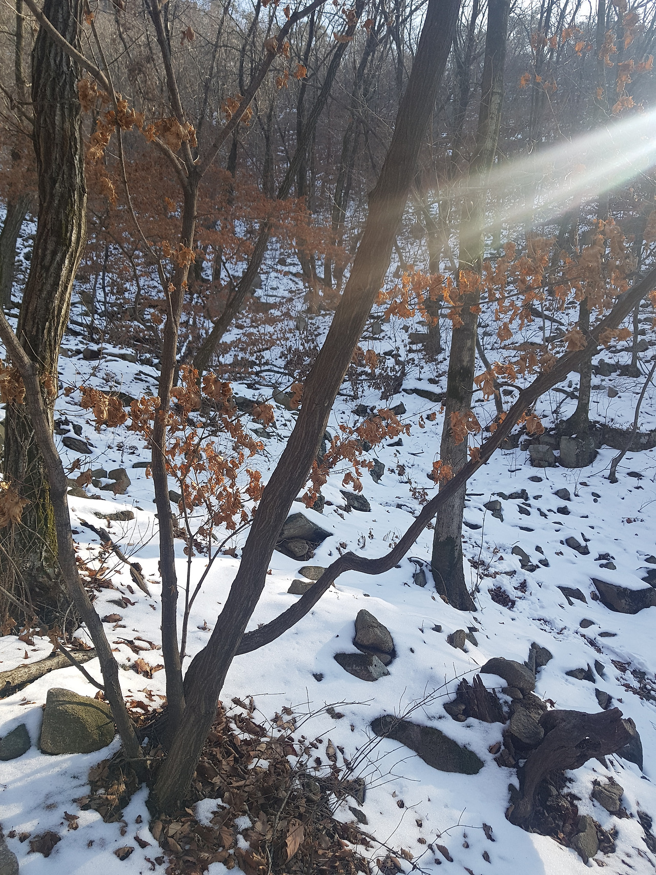 반환점? 쯤 돼 보이는 곳부터는 빛이 닿아 눈이 다 녹아있었고 돌만 보이는 저쪽 길이 내가 가야 할 길? 맞다. 올라야 할 길이다. 낭떠러지같이 돌만 있는 길을 오르다 보면 약 15분이면 정상에 다다른다. 사실 쉬운 길도 있다. 해발 629m, 사실 별로 높지 않아 눈만 없으면 금방 올라갈 수 있겠지...