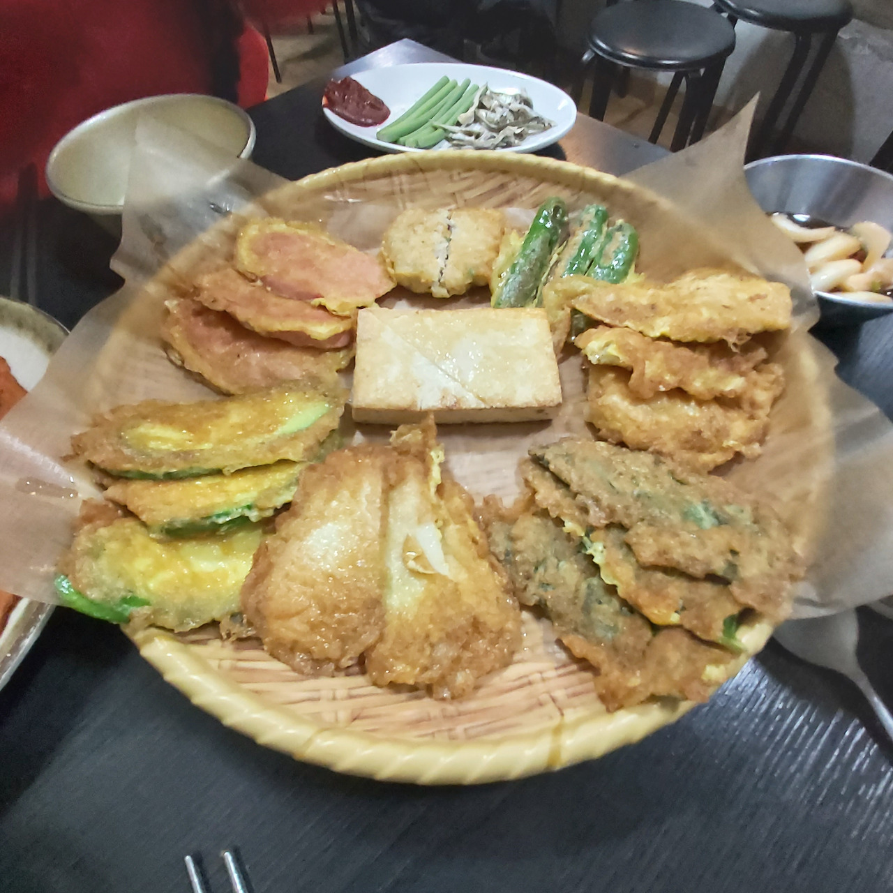 메뉴: 모둠전 외 분홍 소시지 등, 막걸리 (장수, 지평, 알밤)
