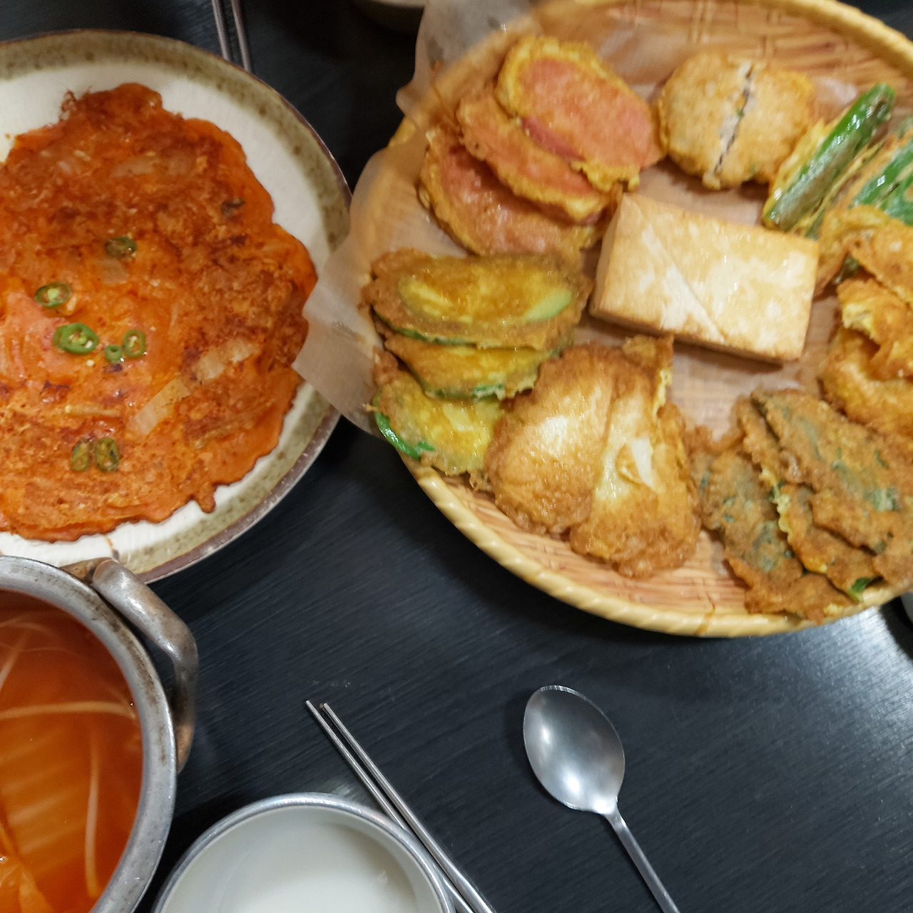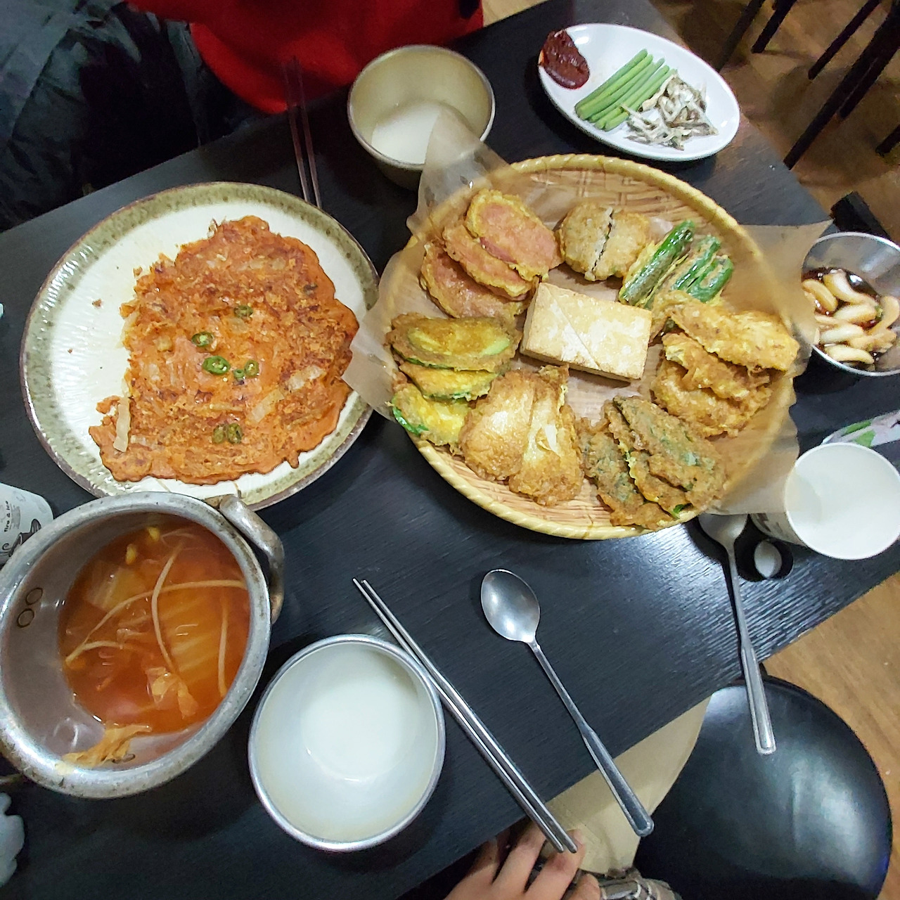김치전까지 포함하여 총 9가지 전이 나온다. 막걸리는 지평, 장수 그리고 전주 알밤막걸리가 있었다. 막걸리가 나옴과 동시 옆 테이블에선 이야기했다.