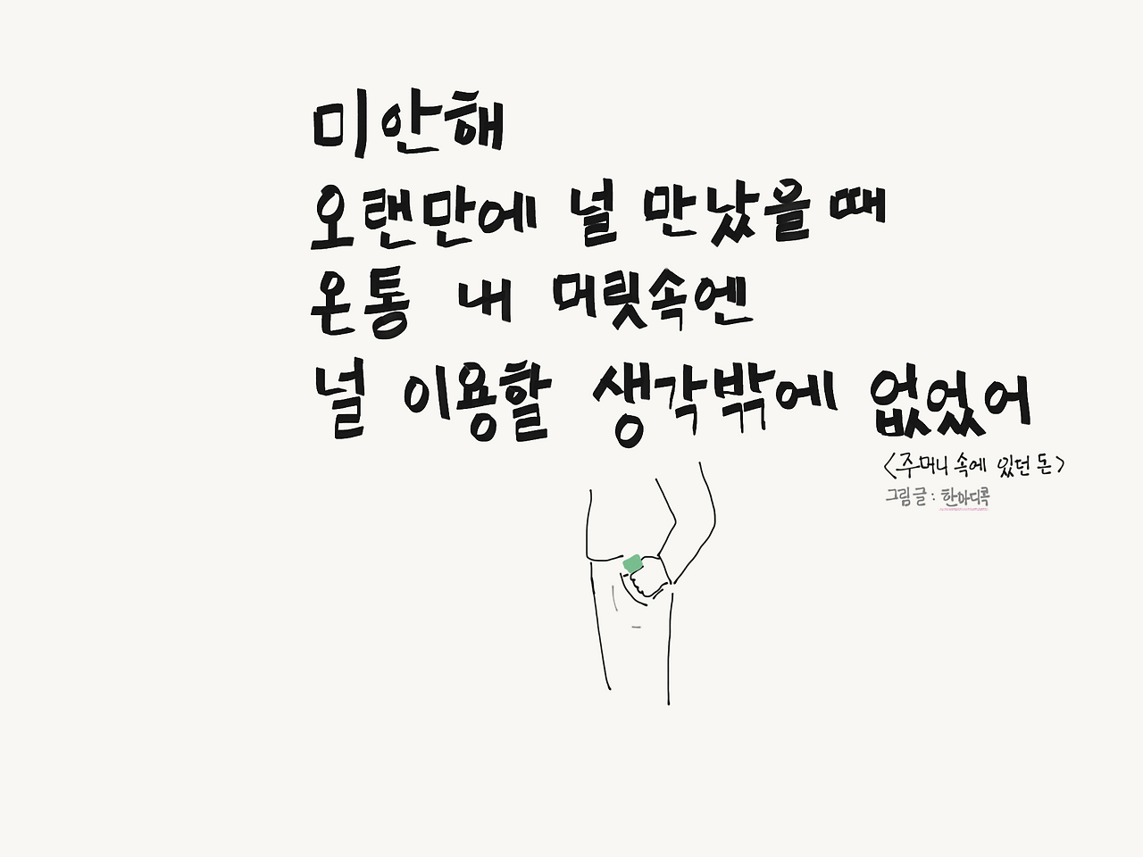 오랜만에 입은 코트나 점퍼, 바지 주머니를뒤적이다 보면 생각하지 못 했던 돈을발견하는 경우가 종종 있습니다돈은 쓰는데에 의의가 있다지만돈 입장에서는조금 슬퍼할 것 같은 기분이 듭니다#한마디콕