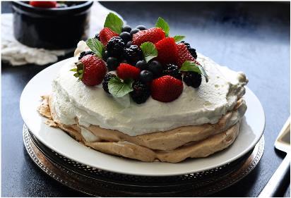 머랭케잌에 휘핑크림을 얹고, 딸기, 블루베리로 장식한다.