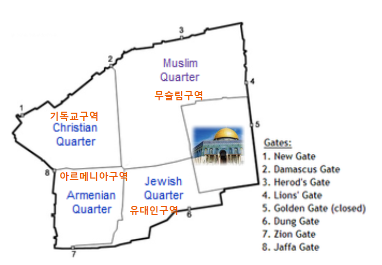 예루살렘 성벽은 4개의 문이 있고, 그 안도 4개의 구역으로 나뉜다.