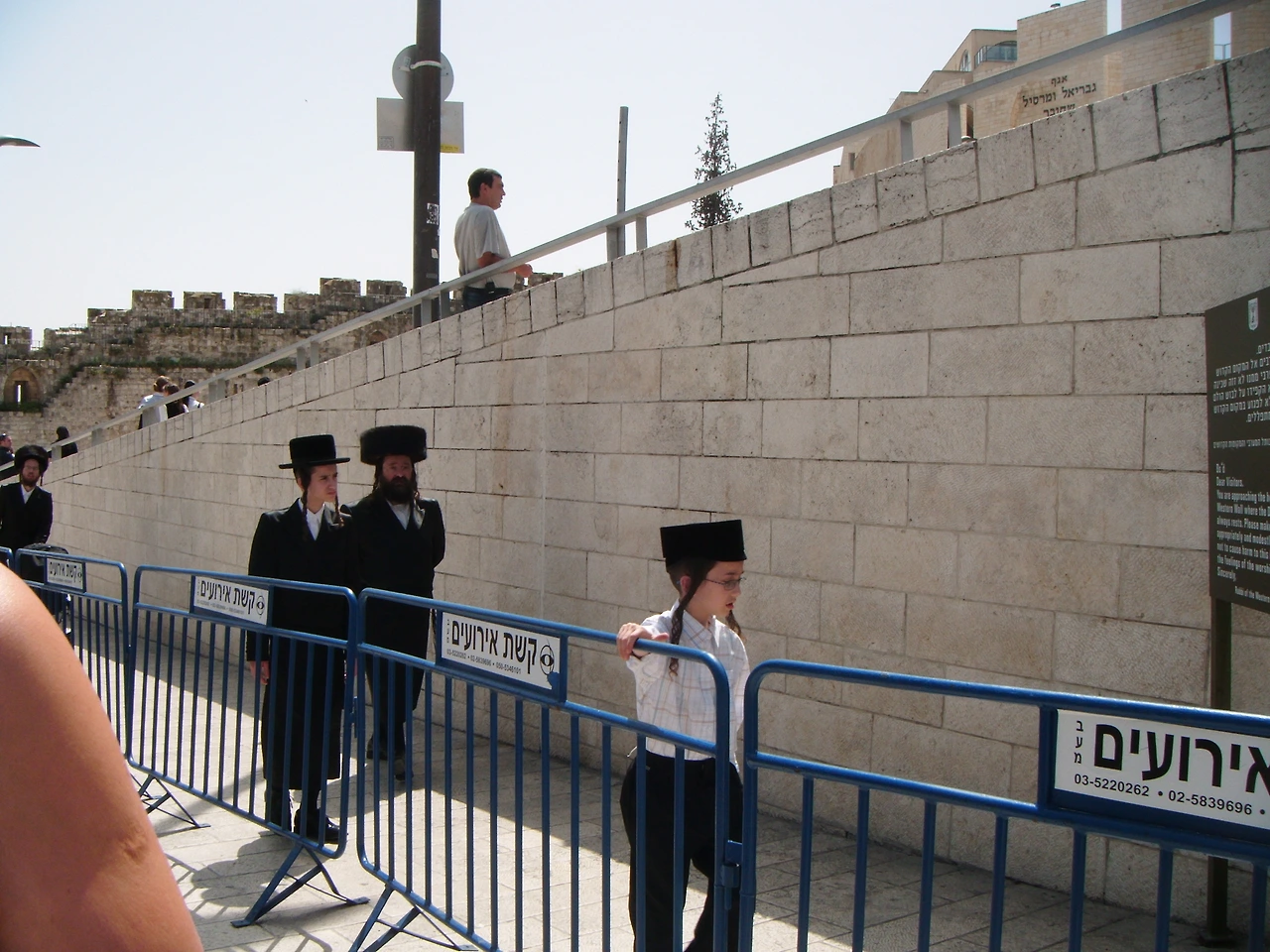 귀 양 옆에 컬링한 머리를 늘어뜨리고, 검정색 모자에, 검정색 긴외투, 이마나 팔둑을 감은 검은 상자, 머리에 빵모자, 이렇게 정통 유대인 의상은 독특하다.