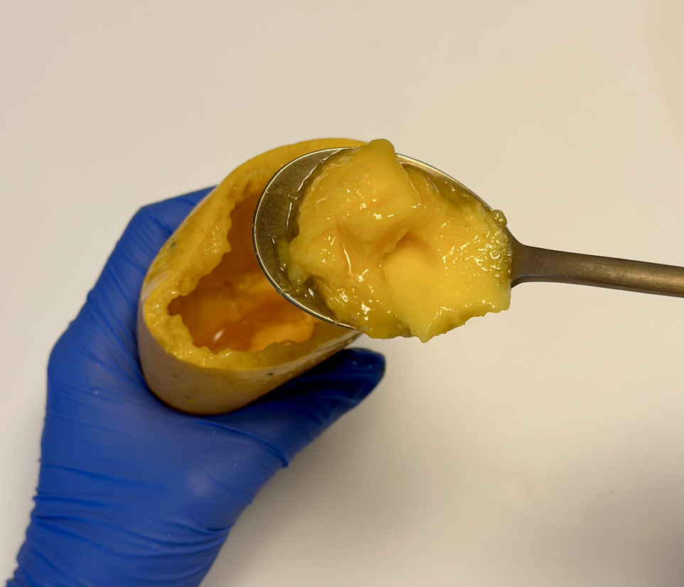 오전에 냉장고에 넣어둔 망고를 하나 꺼내, 반으로 가르고 씨를 빼서 망고 컵을 만들었다. 망고는 격자무늬로 칼집을 내고 뒤집어서 예쁜 모양으로 만들어 먹을 수도 있지만, 이렇게 망고컵으로 만들어서 숟가락으로 먹는 게 손질도 편하고 과육을 알차게 먹을 수 있어서 좋다.