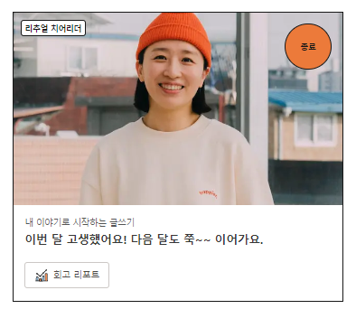 또 제가 1월부터 글쓰기 리추얼 치어리더를 하면서 다른 분들의 글을 읽고 진심을 담아 응원하고 있는데, 다른 분들이 어떤 모습이든 그 자체로 응원하면서 제 자신에게는 혹독하면 그건 말이 안 되는 거잖아요. 모순이잖아요. 다른 분들에게 괜찮다고, 잘하고 있다고 응원하는 것처럼 나를 응원해야 된다고 생각했어요. 이걸 제가 깨닫고 실천하고 있어서 저는 너무 좋았어요.