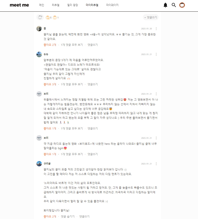누군가의 글에 또 다른 누군가가 진심을 담은 공감을 보내는 것, 자신의 경험과 지식을 나누며 응원하는 것, 누군가 힘이 빠지면, 힘이 있는 누군가가 와서 힘을 더해주는 것. 그래서 내가 쓴 글에 누군가의 진심이, 다정한 응원이 와서 닿을 때 우리는 더 큰 기쁨으로 글을 계속해서 써나갈 수 있다. 글 쓰는 기쁨, 다정한 응원을 주고받는 기쁨을 느낄 수 있는 따뜻하고 안전한 우리의 글쓰기 공간. 이 공간이 있어서, 이 사람들이 있어서 감사한 요즘이다.