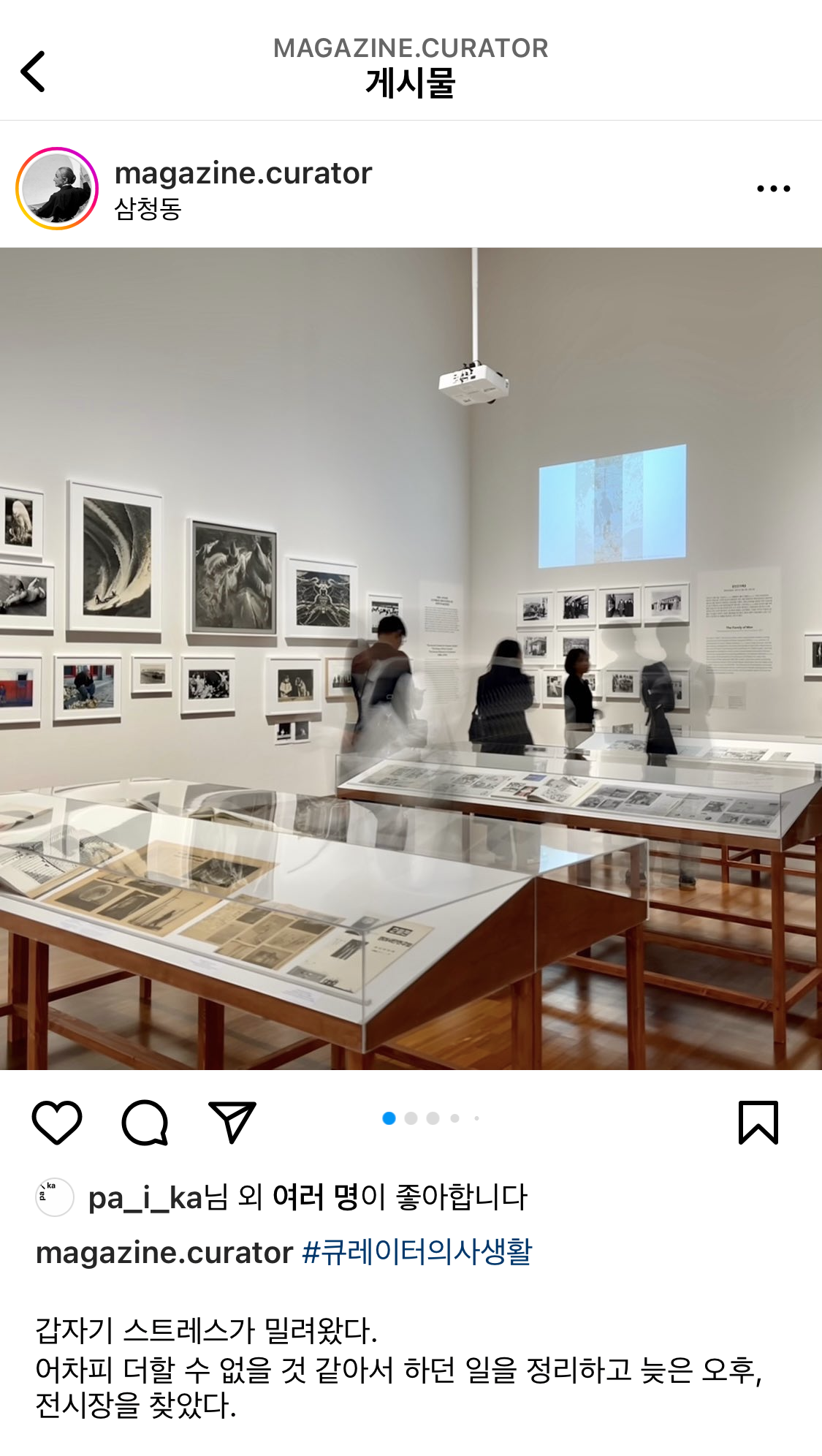 예를 들어 디 뮤지엄이나 그라운드 시소는 사진 찍으러 가는 느낌이잖이? 얼마 전에 예진이랑 갔던 수원시립미술관의 <에르빈 부름: 나만 없어 조각> 같은 경우에도 애초에 인스타그램을 염두에 두고 기획을 한 것 같더라고.