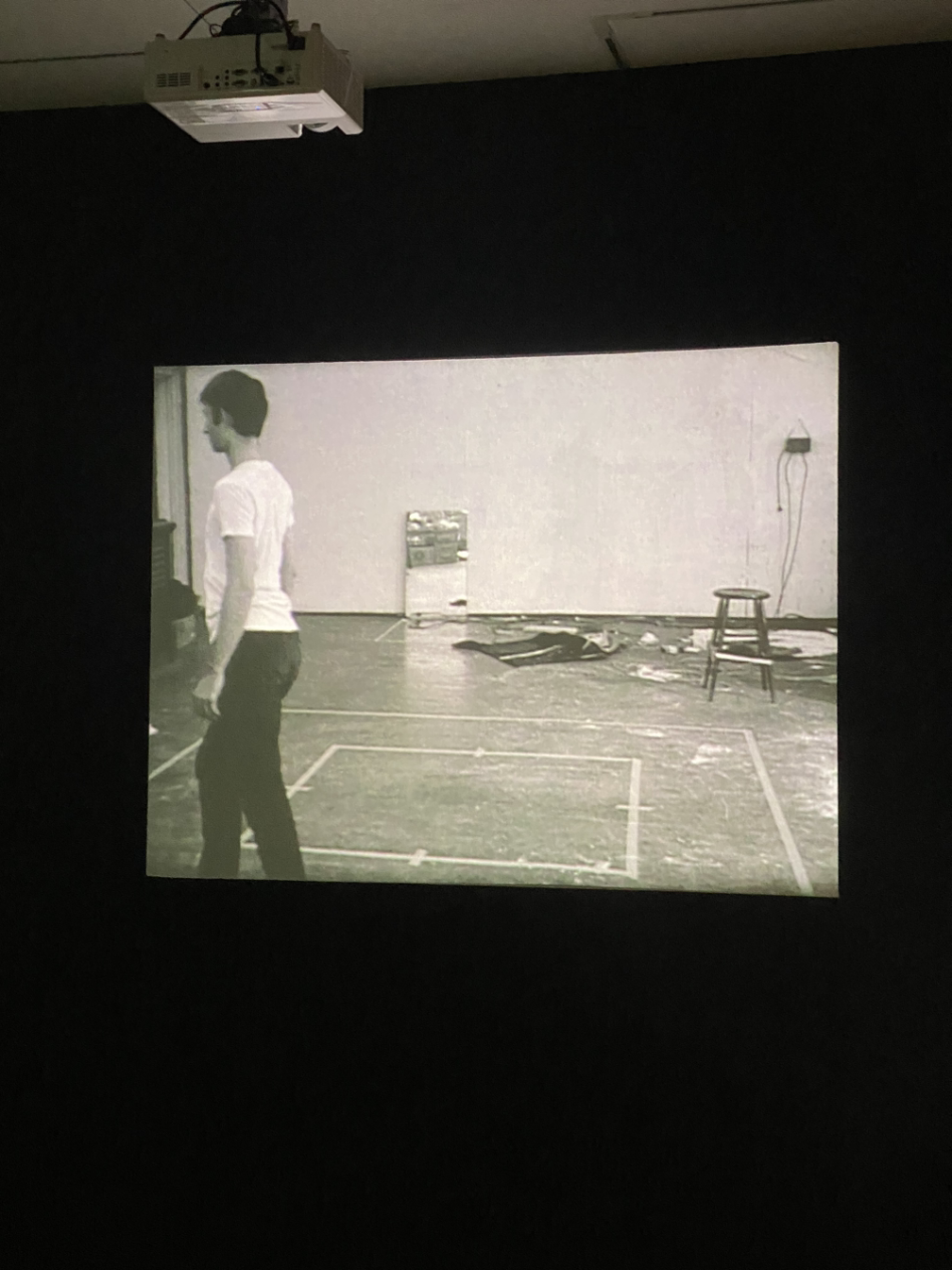첫 번째 작품으로 브루스 나우만의 <과장된 태도로 정사각형 둘레를 걷기>는 과장된 포즈로 정사각형 선 위를 마치 곡예를 하듯이 걷는 자신의 모습을 작가가 촬영한 영상이었다. 걷기의 신체성이 직관적으로 드러나는 작품이어서 전시를 여는 첫 작품으로 좋은 선택이었다고 생각한다.