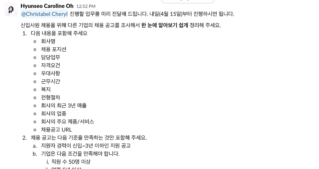 또 다른 프로젝트에서는 기획안을 실행하는 과정에서 잠재 고객에게 콜드 메일이나 인스타그램 DM을 보내야 하는 일이 있었습니다. 약 50명 정도의 유저를 리스트업했고, 그들에게 하나하나 DM을 보내야 하는 작업이었어요. 사실 직접 해도 10여 분 정도가 소요되는 짧은 작업이었지만, 그 일을 2주 단위로 계속 해야 했습니다. 한 번 지시를 해 두면 다음번에는 별다른 지시 없이도 비서님이 알아서 해 주시니까 마음이 편하더라고요.