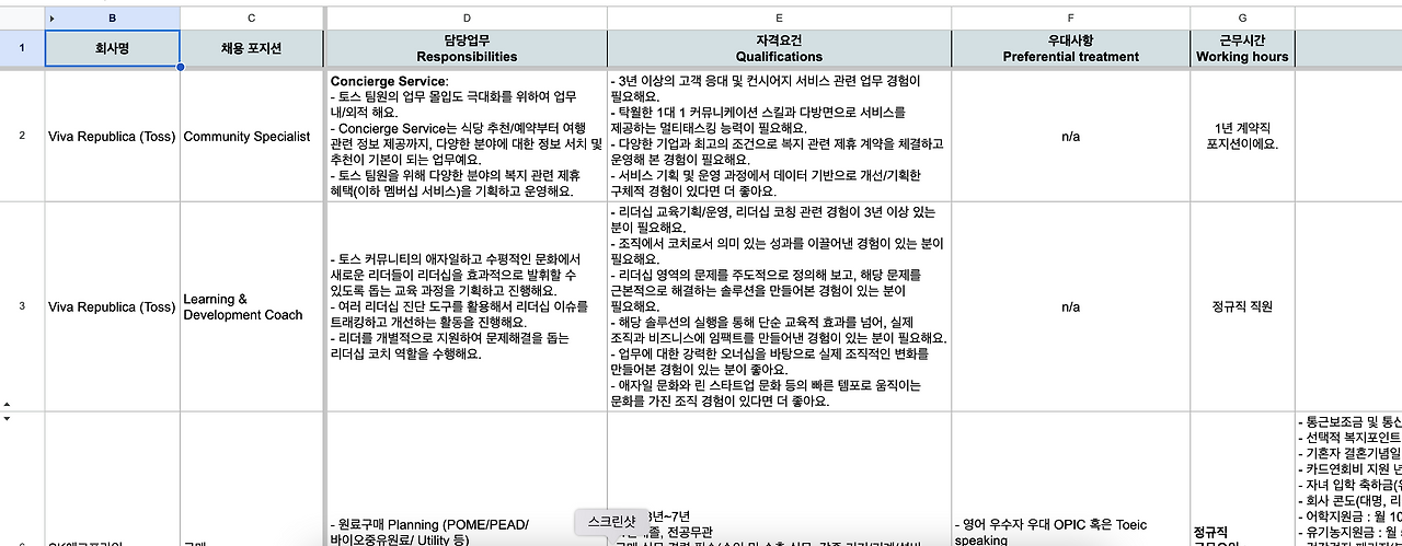 자료 조사 작업은 웬만하면 비서님께 맡깁니다. 이를테면 제가 한창 이직 준비를 하고 있었을 때, 비서님에게 제가 원하는 조건을 갖춘 회사를 모두 찾아서 엑셀에 정리한 다음, 그 회사들의 채용 공고를 알려달라고 했어요. 저 혼자 했으면 분명 수 일이 걸렸을 일을, 비서님이 대신 해주시니 저는 그 시간에 제 포트폴리오를 더 다듬었습니다.