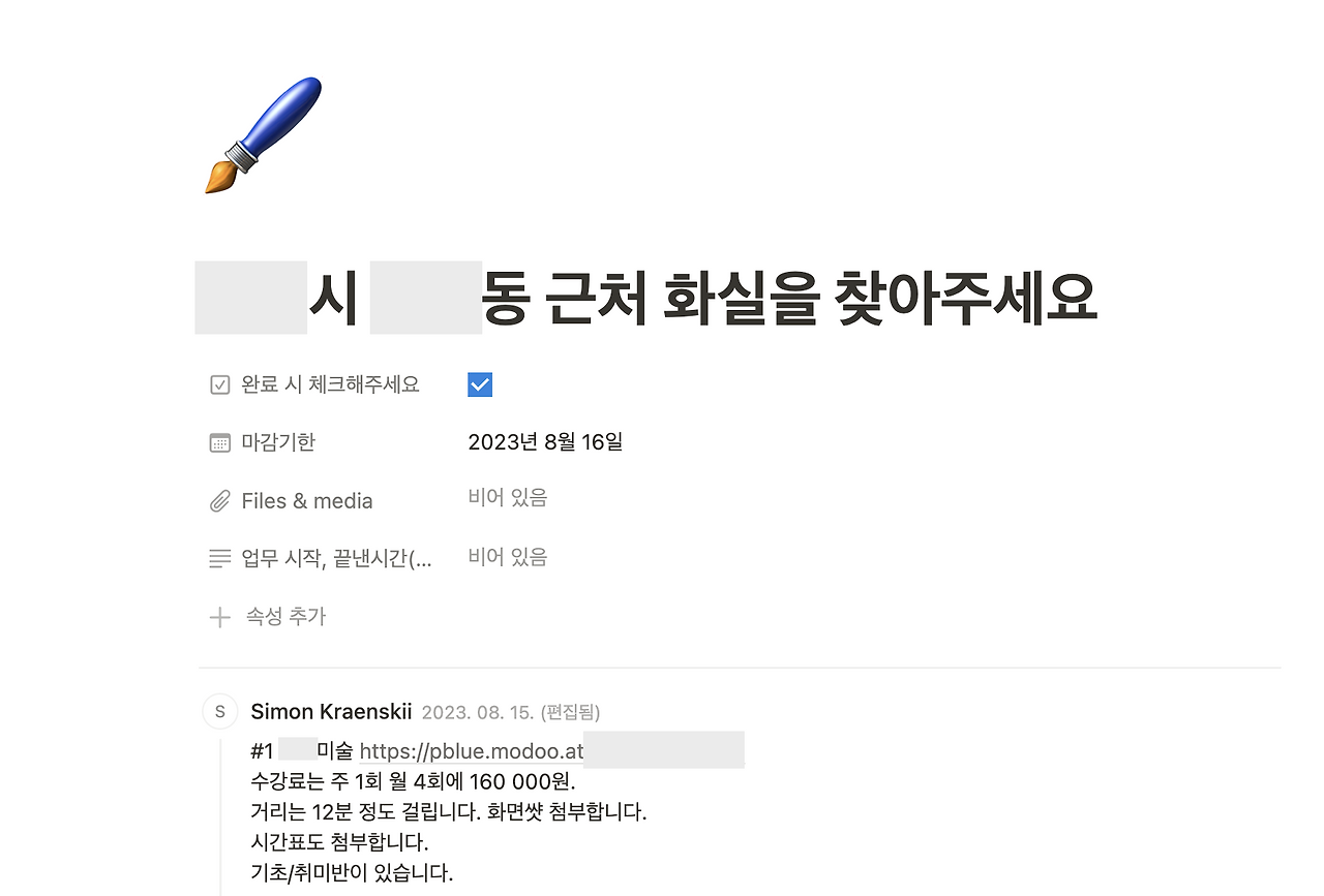 장소 리스트업과 대관도 원격 비서님에게 맡깁니다. 오프라인 모임을 주기적으로 열어야 하는 프로젝트를 한 적이 있는데요. 매 회차마다 장소를 옮겨가며 진행했기 때문에 모임을 열 만한 장소를 찾는 것도 일이었습니다. 화실이라는 특수한 공간을 빌려야 했기 때문에 적당한 공간을 찾는 것이 쉽지 않았습니다. 대관비가 무료이거나 저렴해야 하고, 책상과 의자가 인원수만큼 충분히 구비되어 있으면서도 너무 후미지지 않은 곳을 찾으려면 하루가 꼬박 걸릴 때도 있었어요. 하지만 저는 원격 비서를 고용한 이후로 비서님에게 공간을 찾는 일과 예약하는 일을 모두 위임했고, 매 주 시달렸던 장소 대관 업무로부터 벗어날 수 있었습니다.