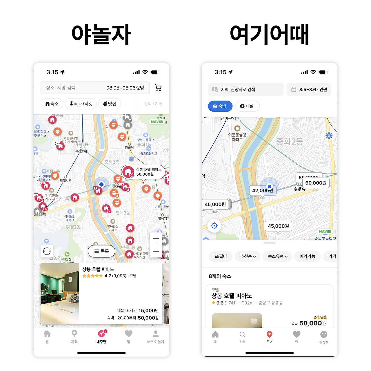 이러한 질문과 함께 ‘왜 이렇게 만들었을까' 고민해보고 같은 카테고리의 제품을 비교해보는 것을 추천드려요. 간단하게 야놀자와 여기어때의 앱을 비교해본다면, 내 주변에 숙소, 레저, 맛집 등을 모두 보여주며 모든 놀거리를 추천하는 야놀자에 비해 여기어때는 숙박에만 집중하고 있어요. 이러한 차이점에서 프로덕트가 어떠한 가치를 전달하려는지 알 수 있어요.