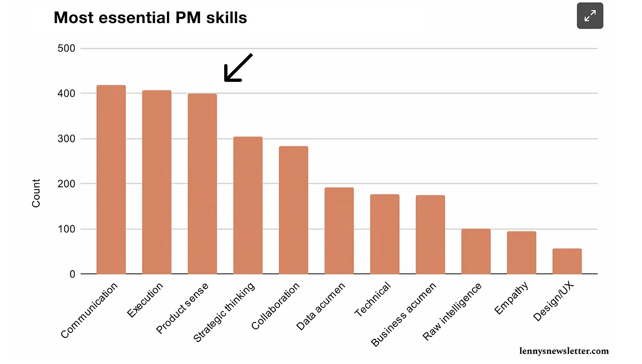 Airbnb 프로덕트 리더, Lenny Rachitsky는 탁월한 프로덕트 센스는 프로덕트에 유의미한 변화를 주어 의도된 임팩트를 남기는 것이라고 설명합니다. 사실 단어가 생소할 뿐이지 제품을 제작하거나 개선을 통해서 유저의 문제를 해결해주는 능력이라고 볼 수 있겠네요. 1,000명의 PM에게 물어본 결과, 소통력, 실행력 다음으로 프로덕트 센스를 가장 중요한 스킬이라고 답했습니다. 실리콘벨리에선 많은 CEO와 PO/PM이 계발하고 있는 능력이에요.
