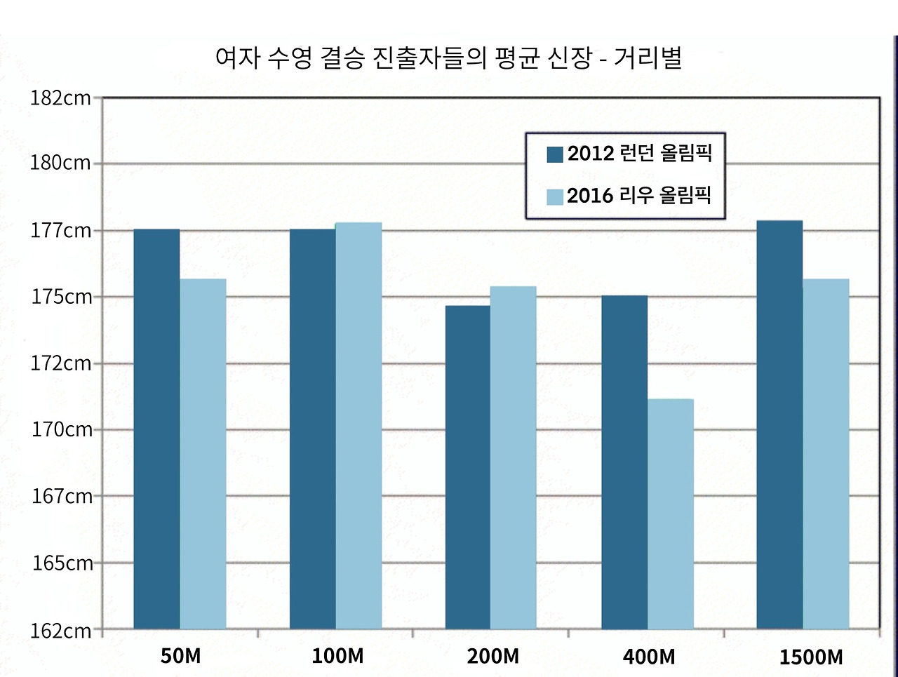 여자 수영 선수들의 평균 키는 175cm였다.