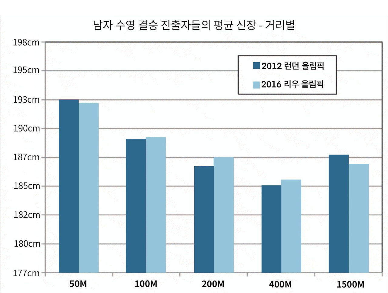 2016년 리우 데 자네이루 올림픽 결승에 참가한 남자 수영 선수들의 평균 키는 188cm이었고
