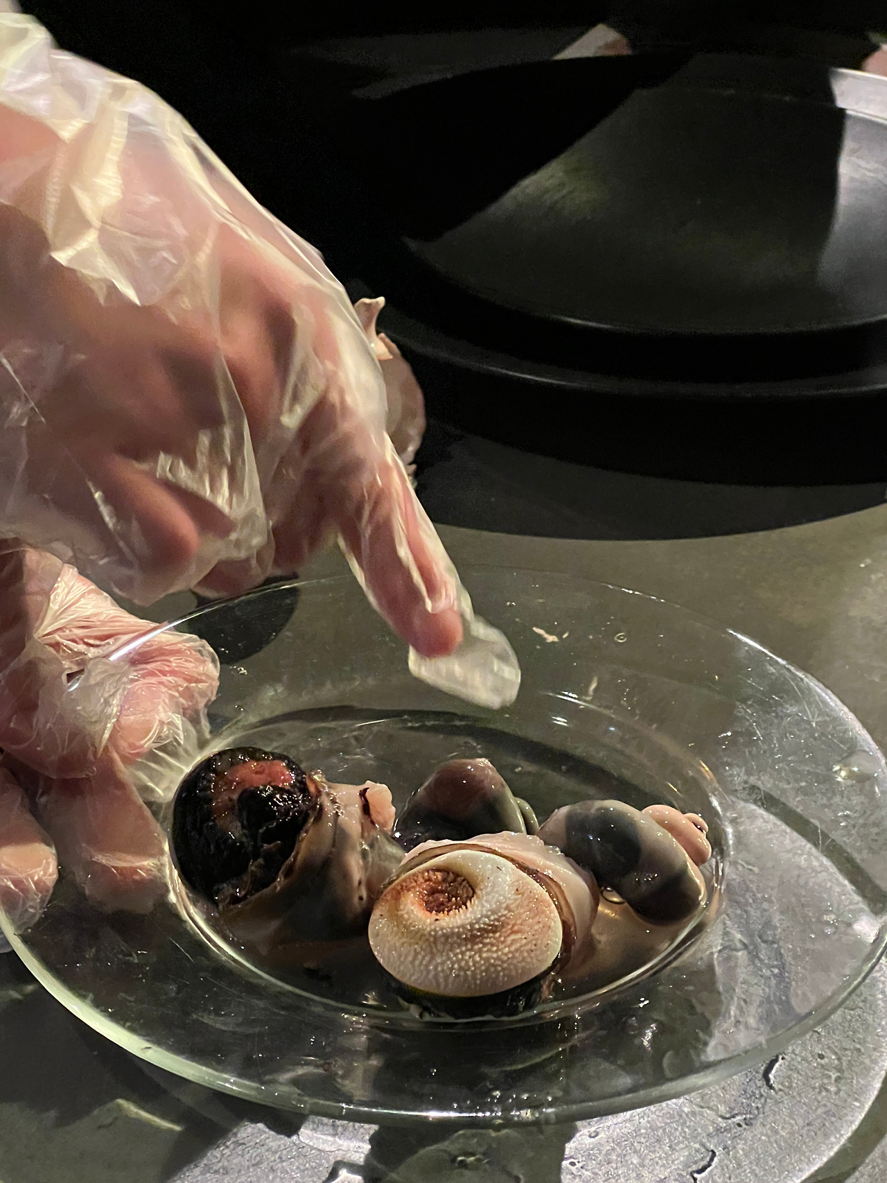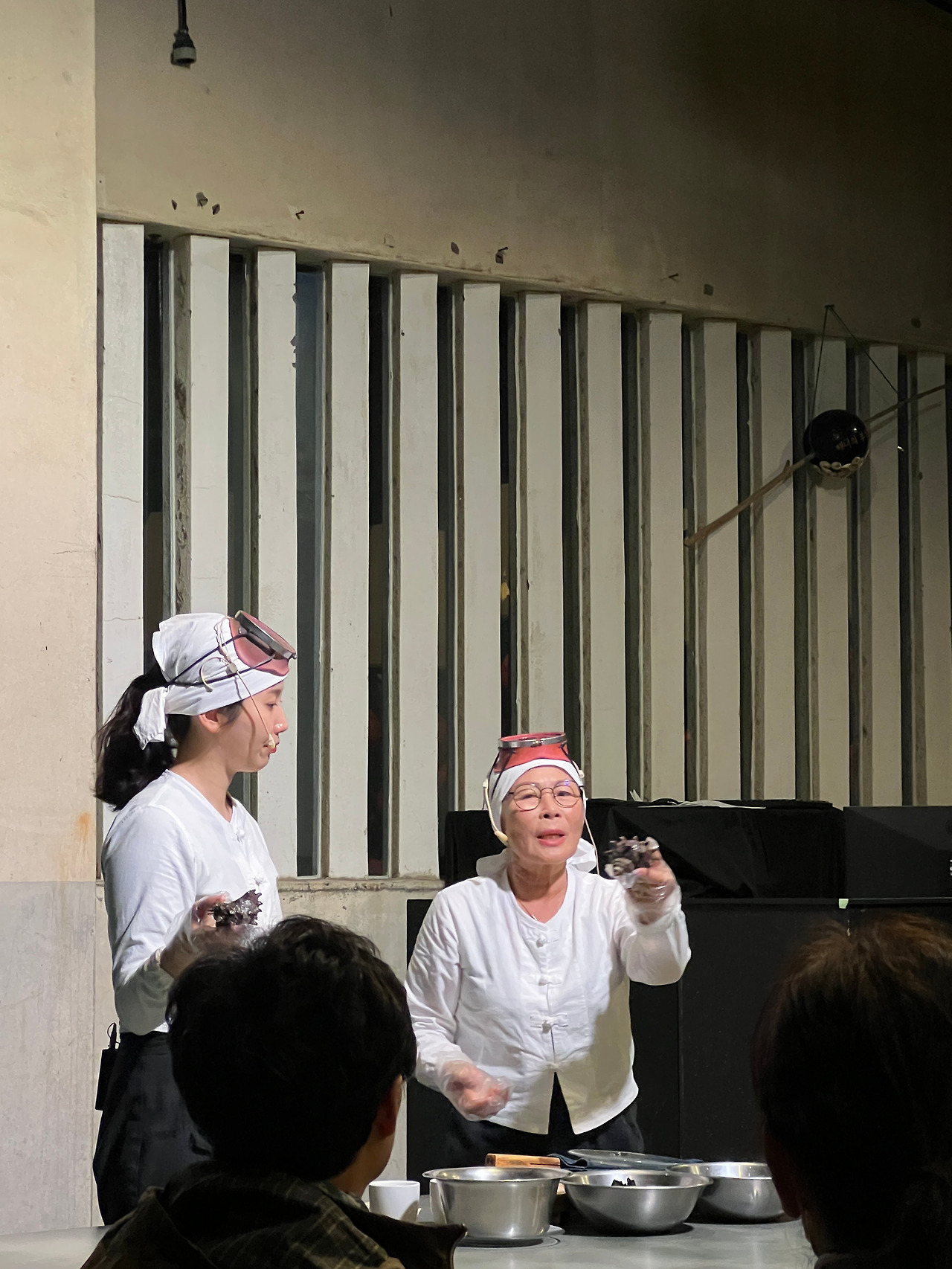 공연의 내용이 다소 무겁다보니 바로 식사로 이어지기엔 조금 난감(?)하지 않을까 했는데 해녀 할머니와 배우님이 나오셔서 요리를 준비하는 동안 해산물 설명을 해주신다. 그런데 해녀 할머니와 배우님의 쿵짝이 너무 귀여워서 직전 공연의 무게감을 삭 환기시키고 싱싱한 해산물을 직접 회치면서 설명해주시는데, 입맛이 싹 돌게 한다. (이렇게 천재적인 구성이 있나!)