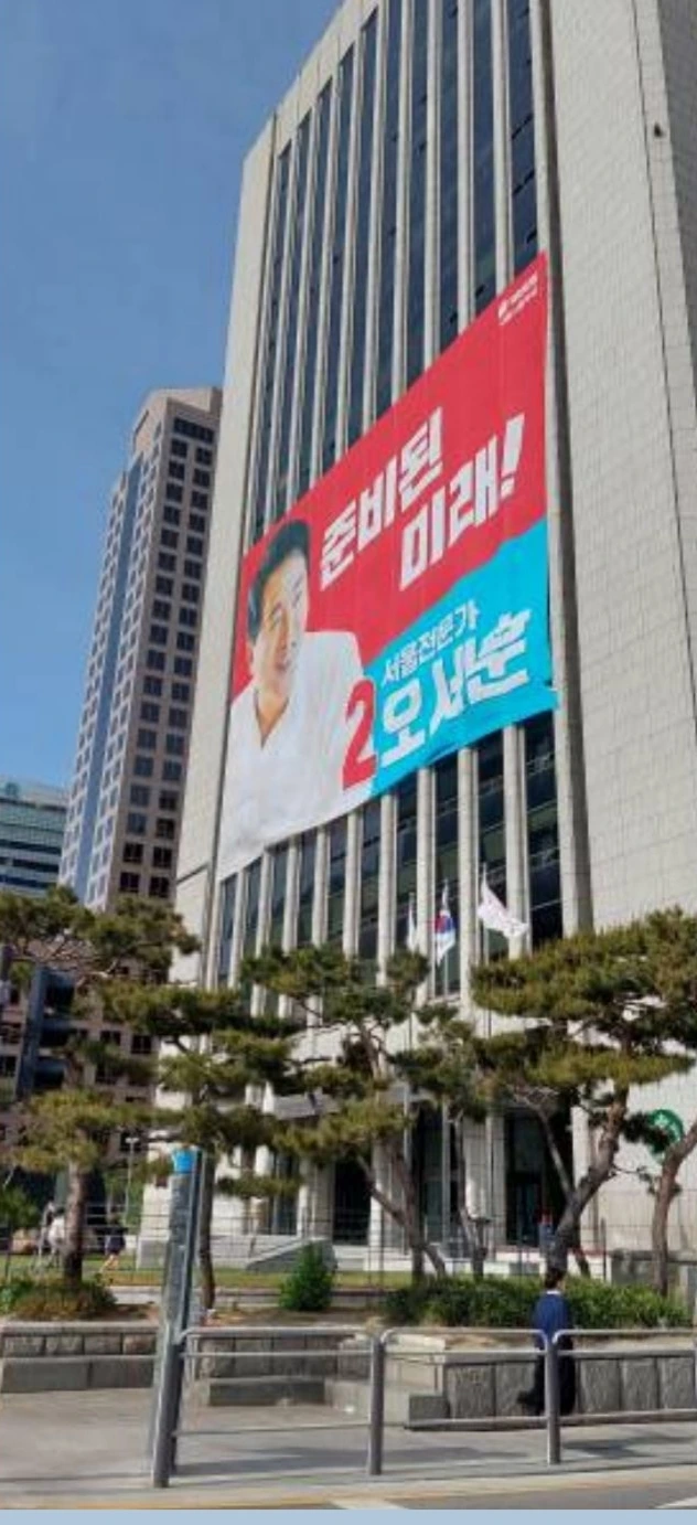 오세훈 국민의힘 서울시장 후보가 15일 한국 언론인의 전당인 프레스센터 건물에 내걸었던 선거 홍보 현수막을 철거했다. 13일 프레스센터 전면 외벽에 얼굴 사진과 함께 '준비된 미래'라고 쓰인 대형 현수막을 붙인 뒤 3일 만이다.