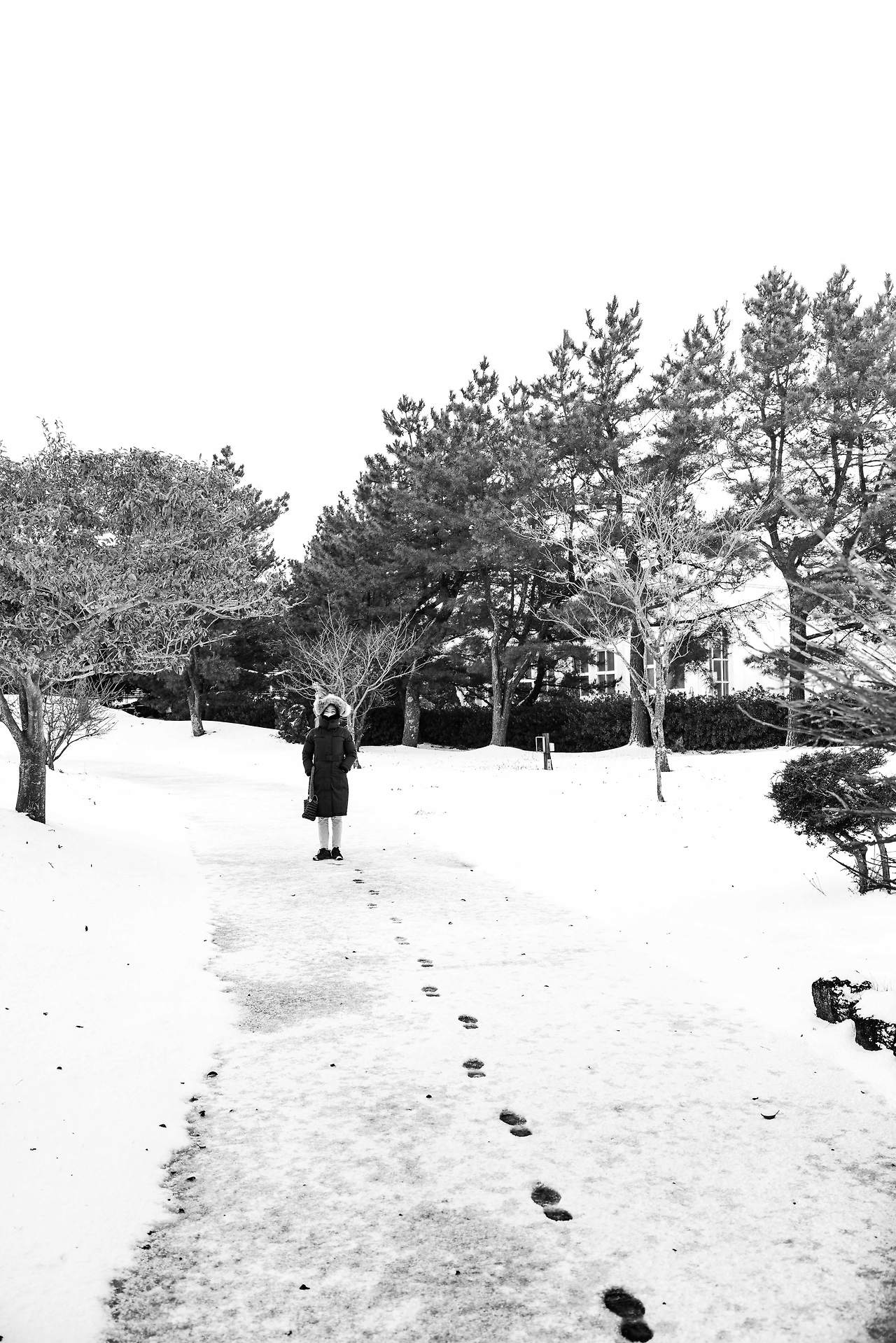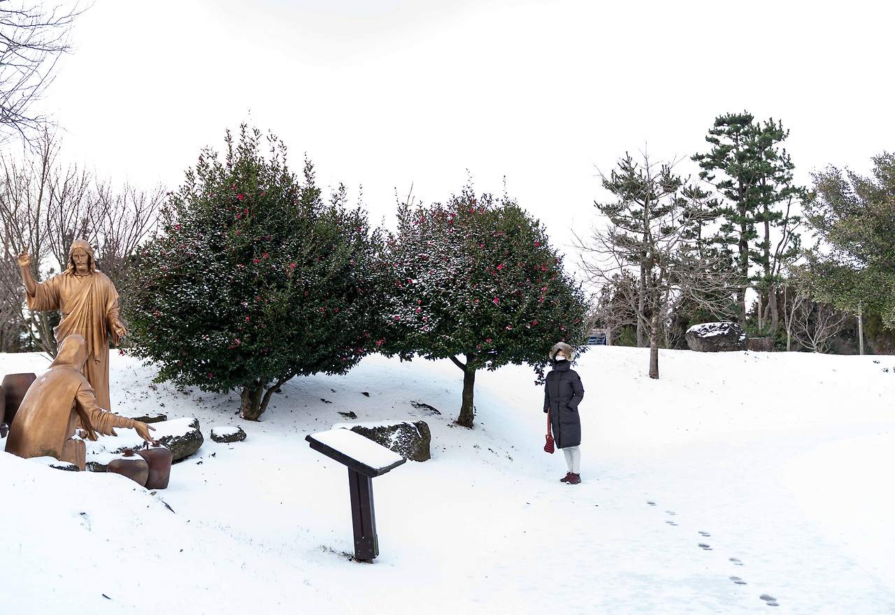 오늘의 코스는 천주교 사제인 패트릭 제임스 맥그린치(P. J. Mcglinchey) 신부(후에 '임피제'라는 이름으로 귀화)가 1961년에 처음 만들었다는 '성이시돌 목장'입니다. 아일랜드에서 온 파란 눈의 신부는 평생을 제주에 헌신했다고 해요. 가난한 제주도민을 위해 황무지를 개척해 아시아 최대의 목장을 건설한 앙트레프레너이자 박애주의자입니다. 2018년 4월에 별이 된 임피제 신부님의 순결한 영혼을 느끼며 아무도 걷지 않은 눈 쌓인 하얀 길을 걸었습니다. 제 마음의 때가 벗겨져 나가는 느낌이었어요.
