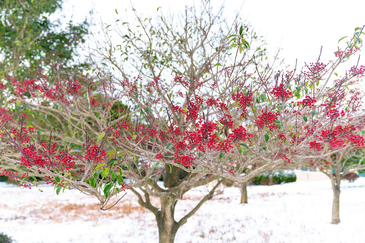 서귀포에 자생하는 나무인데요. 잎을 모두 떨군 나뭇가지에 이렇게 선명하게 빨간 동그라미가 조롱조롱 매달려 있어요. 설원과 대비되는 빨간 열매... 우리 동네 안덕면 가로수는 이 예쁜 먼나무랍니다.