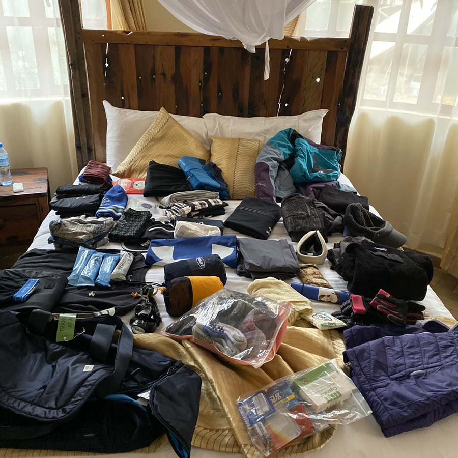 등산이 취미인 사람도 아니었기에, 등산 용품들을 구하는게 가장 시급했다. 엄마의 등산복부터 남동생의 작아진 패딩까지 이것저것 전부 모아 킬리만자로 등산을 준비했다. 첫 이틀은 햇빛이 강렬하니 챙이 큰 모자를 꼭 챙겨야한다. 마지막 이틀은 -20도에서 -30까지 내려가기 때문에 오른쪽 사진처럼 가릴 수 있는 모든 부분을 최대한 가릴 수 있도록 준비해야했다. 옷에 부착할 수 있는 손난로도 필수라하여 30개를 준비해갔다.