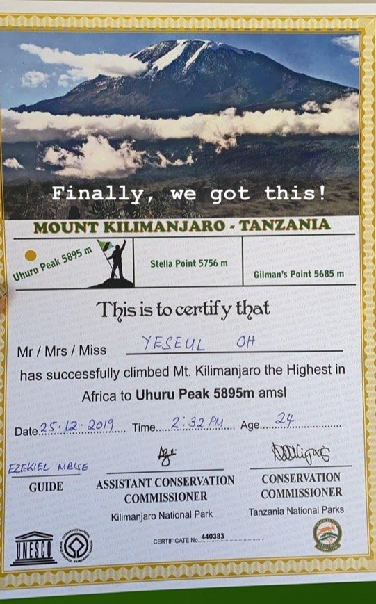 그토록 간절히 원했던 킬리만자로 트래킹 증명서를 받았다. 보기만해도 벅차오르는 증명서이다.