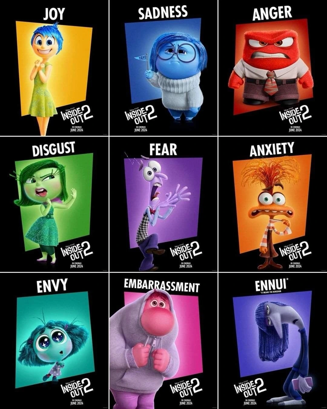 <인사이드 아웃>이 흥행할 수 있었던 요인에는 많은 것이 있지만 무엇보다도 추상적인 감정들을 귀여운 캐릭터화시켰다는 점에 있다. “기쁨이(Joy)”, “슬픔이(Sadness)”, “소심이(Fear)”, “까칠이(Disgust)”, “버럭이(Anger)” 이 다섯 감정들의 참신한 캐릭터성과 각 감정들과 관련된 관객들 개인의 경험에서 오는 공감이 많은 사람의 환호를 얻어냈다. 이번 <인사이드 아웃 2>에서는 기존의 5 감정들에게서 새롭게 4명의 감정들이 추가되었다. 바로 “불안이(Anxiety)”, “부럽이(Envy)“, “따분이(Ennui)”, 그리고 “당황이(Embarrassment)”이다.