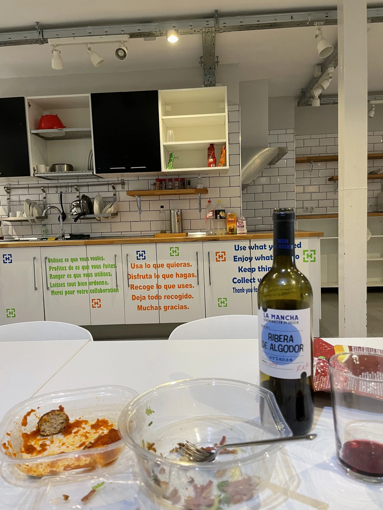 호스텔 공용 식당에 앉아 마트 음식과 와인을 먹으니 혼자 있는 이 여유로운 시간이 참 좋았다. 공용 공간이라서 간간이 오고 가는 순례자 친구들과 인사도 나눌 수 있었다. 그러다가 어느새 나의 테이블은 누구에게나 열린 작고 편안한 "팝업 다이닝"이 되었다. 자기도 모르게 마음을 꺼내놓는 마법 같은 테이블.