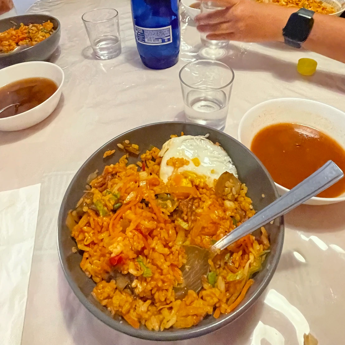향기로운 된장국과 비빔밥이 테이블 가득 세팅되어 있다. 어떻게 알았는지 Y가 참기름을 넣어야 한다며 추가 요청을 했다. 조금만 덜어서 나올 줄 알았는데 주방에서 참기름 한 통을 그냥 가지고 나온 직원. 하하. 덕분에 그 참기름병은 모든 테이블을 다 돌았다. 스페인에서 구하기 어렵고 비쌀 텐데.. 우리가 다 해치우는 건 아닌지 나 혼자 조금 땀이 났다. 다행히 참기름 통이 비지는 않았다.