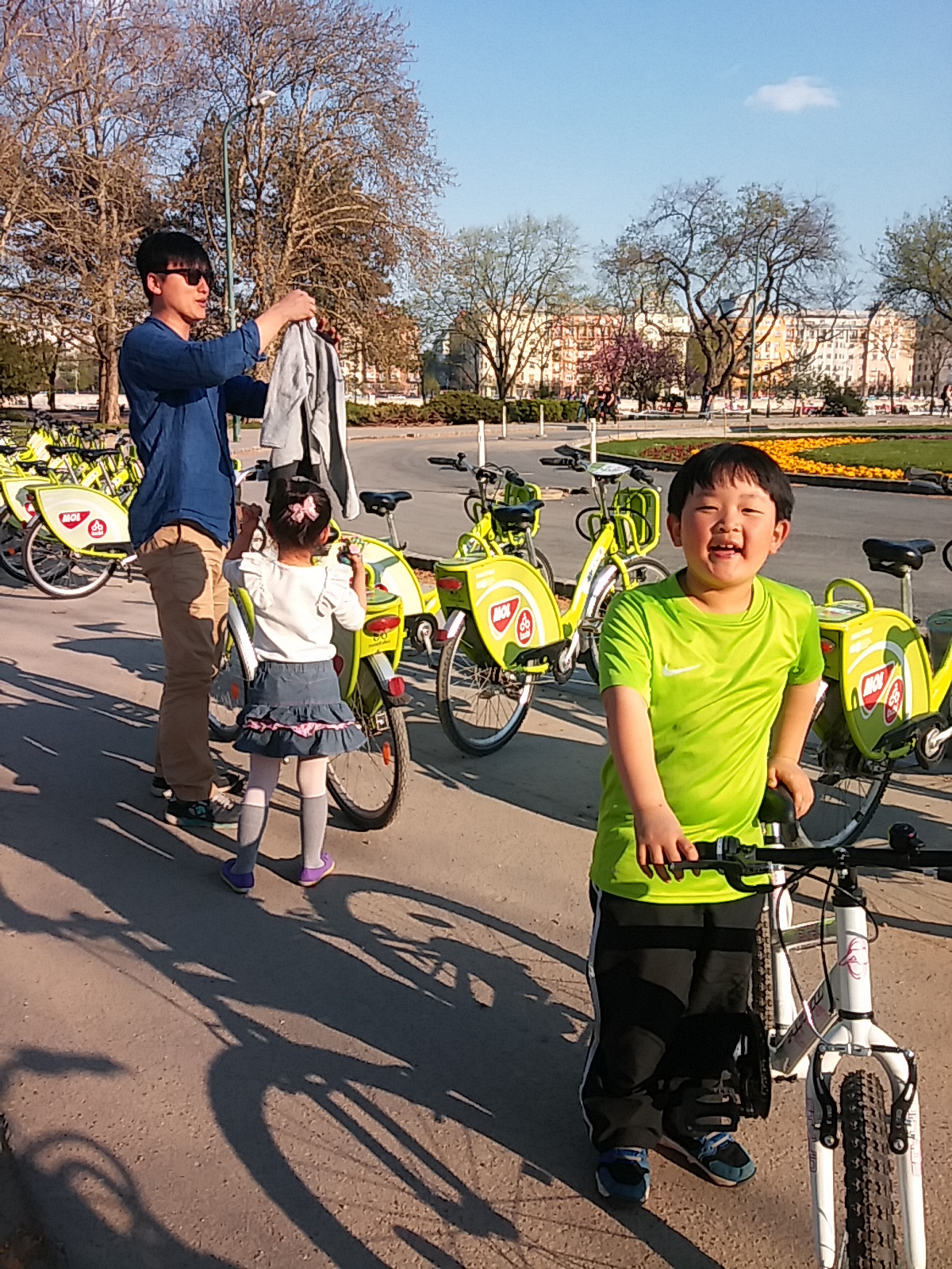 이거 빌려본다고 체크카드 앱에 등록하고 난리 법석을 떨어서 두대를 빌렸는데 이게 또 웃긴 게 24시간 정액권을 초과금액 없이 타려면 30분이내에 자전거 정거장에 도킹?을 해야 하는 약간 이해되지 않는 시스템을 하고 있어서 여유 있게 뭐 사진 찍고 그런 거는 상상도 못 하고 학원 앞에서 빌려서 일단 달려! 무사히 도착했음 된 걸로 하자! 했었던 기억이 난다. 4년이 지난 요새는 공용 싱싱 카가 부다페스트 시내를 싱싱 다닌다. 막상 돌아다니다 보면 자전거보다는 싱싱 카를 더 많이 타는 것 같은데 싱싱 카는 생각보다 많이 비싸기도 하고 교통사고의 원인으로 문제거리가 되기도 했다. 딴 길로 빠진 얘기지만 요새 우리 가족은 부비도 아니고 싱싱 카도 아닌 공유차(리모)를 제일 많이 사용하고 있다.(한국에서도 '쏘카'를 이용해본 유저로서 볼때 헝가리 공유차는 매우 합리적이고 사용하기도 편하다.)