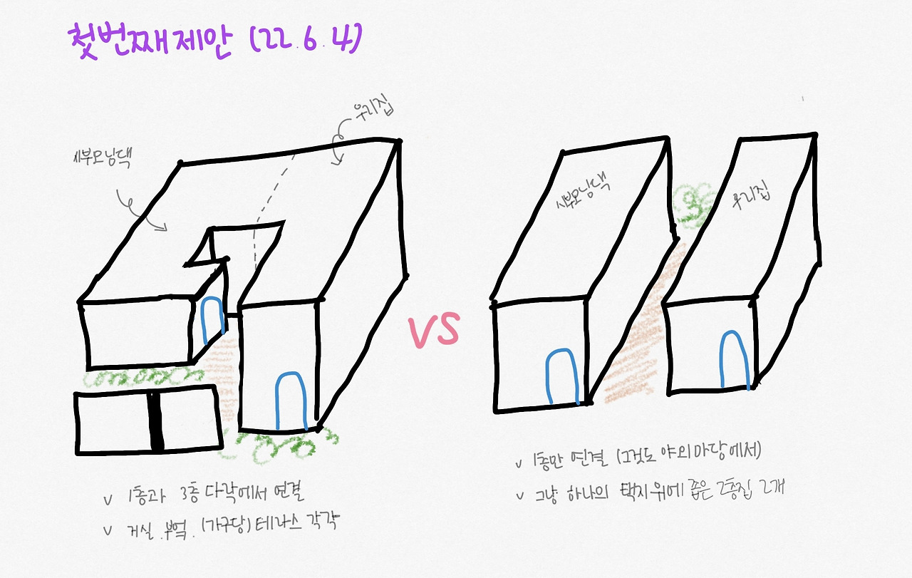 흠... 뭐지? 최종 목표로는 '하나의 집'을 지향하기 때문에 겉으로 보았을 때부터 하나의 큰 덩어리 집을 원했고, 이를 위해 우리 부부&자녀만 쓸 수 있는 공간을 포기하는 것으로 마음을 먹었는데? 첫 번째로 제안한 집들은 옵션에 관계없이 하나같이 완전히 분리된 집의 모습이었다. 내가 요구했던 #며느리 입장에서의 #프라이버시 보호가 완전히 구현된 집이긴 했다. 근데 막상 결과물을 보니 이건 좀 아닌 것 같다. 물론 원한다면 마당을 통해 연결이 되는 구조였지만 뭐랄까, 아파트 옆 집 사는 느낌? 그러나 건축사분들 앞에서 가족 구성원 들 중에 아무도 불만을 표하지 않는다...? 나만 불만인 것인가?