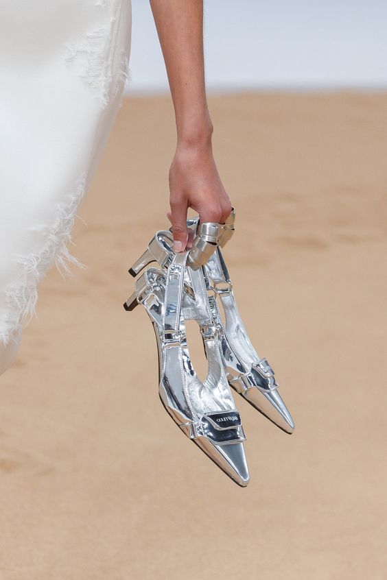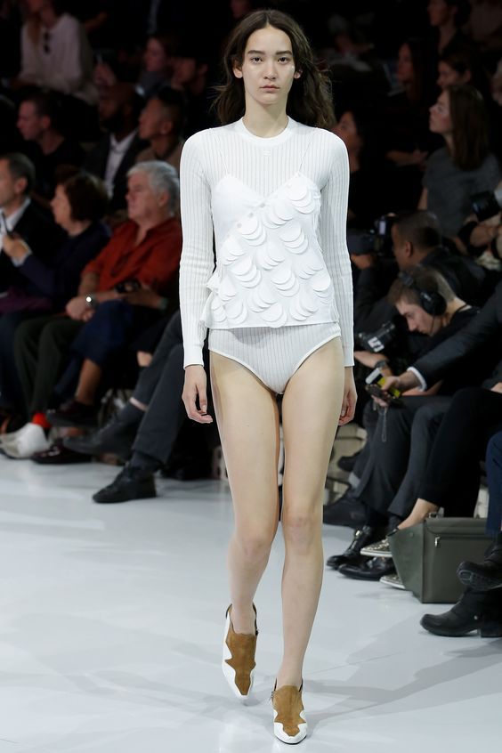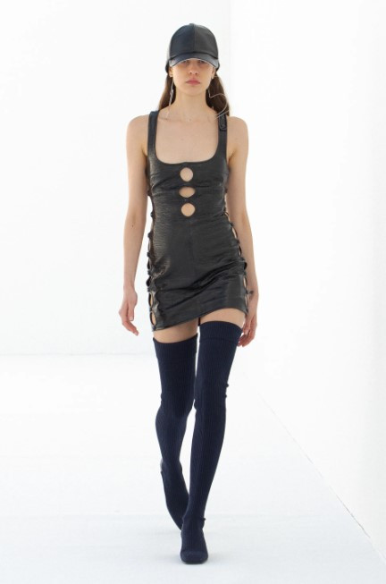 이후 모델들은 니트 드레스, 글로시한 가죽 탑을 입고 등장하며, 이 쇼의 하이라이트였던 커다란 거울 펜던트가 달린 컷아웃 형태의 드레스에서 쿠레쥬의 시그니처 디자인인 사이드 컷아웃과 유사한 디자인 요소를 발견할 수 있다.
