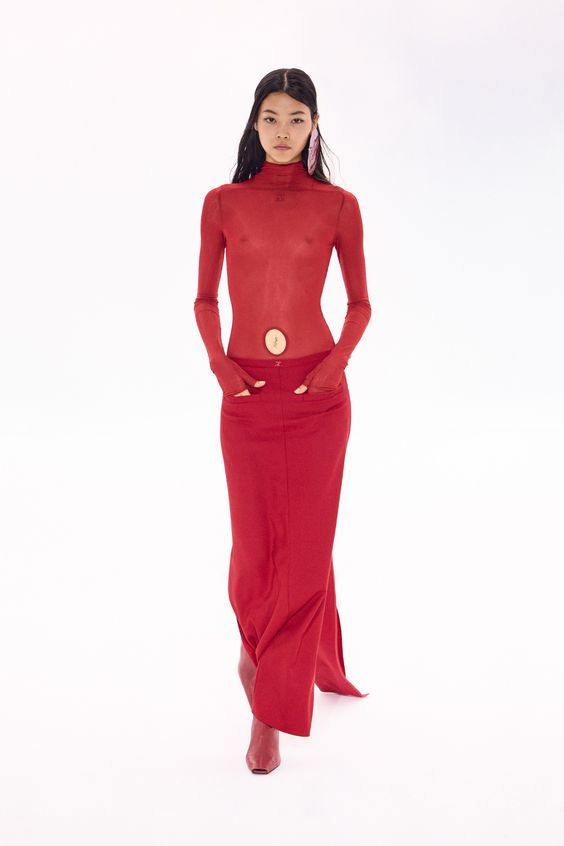 짧은 헴라인, 극단적인 컷아웃 디테일, 기하학적 실루엣으로 배경과 극명한 대조를 의도한다.