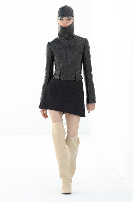 또한 André Courrèges의 에리타주 패턴을 동시대의 시선으로 재해석한 가죽소재의 재킷과 미니스커트.