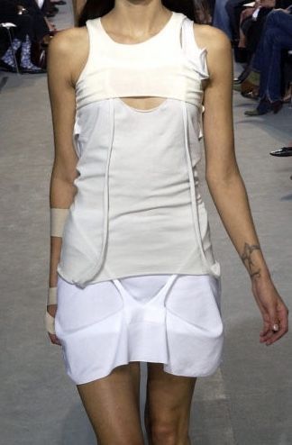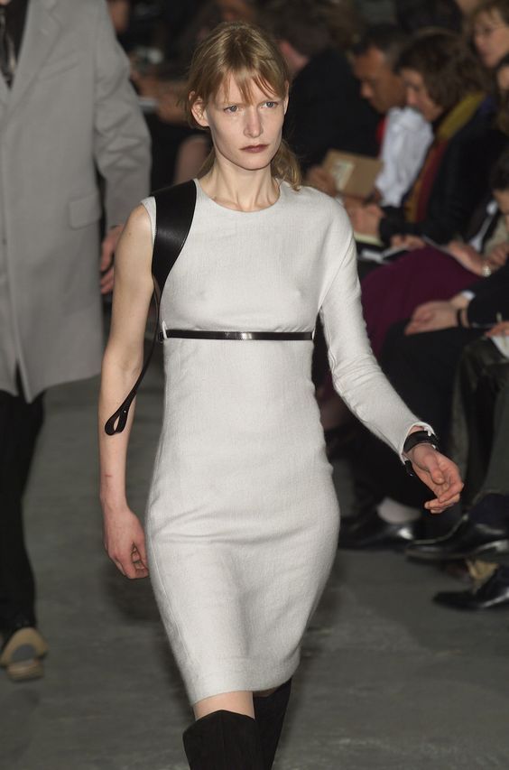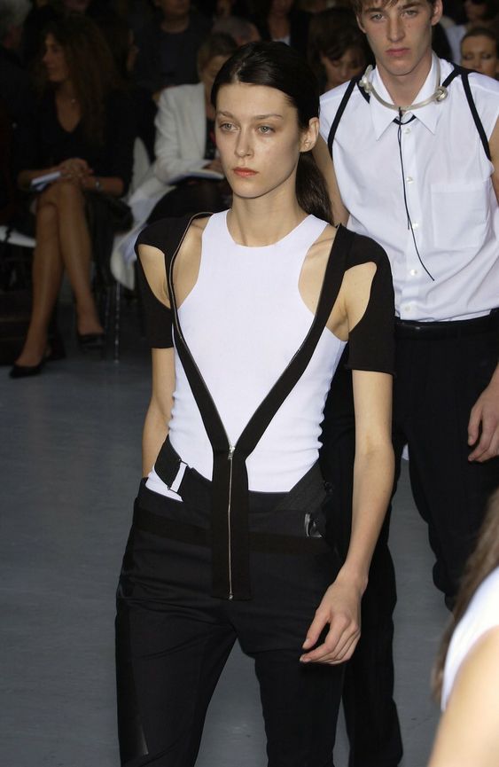 본디지 스트랩, 하네스로 중성적이고 실용적인 미니멀리즘과 고무, PVC 등 하이테크 소재들을 주로 사용하며 고급스러운 미니멀리즘과 특징적인 실루엣을 만들었다.