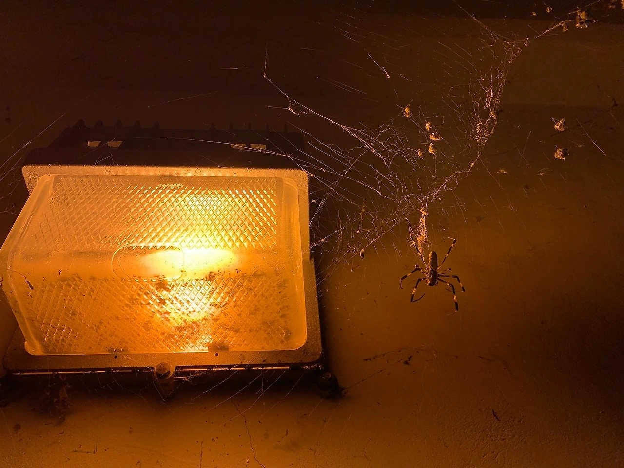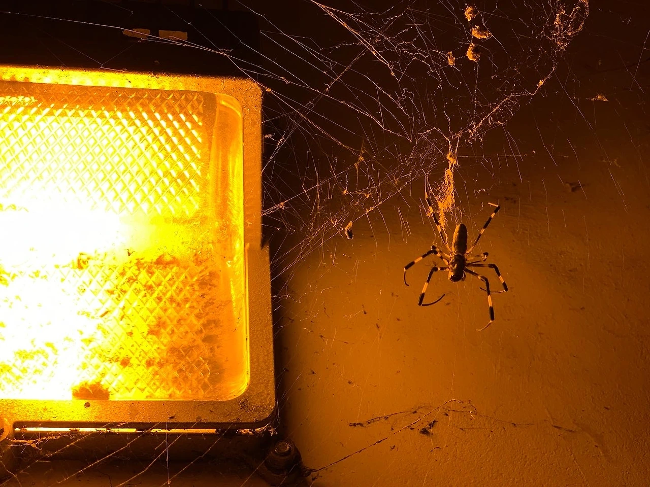 엄지 손가락 크기의 거미가 조명을 받으며 가만히 있다. 평소 볼 수 없던 크기의 거미를 보며 사진을 찍기 시작했다. 노란색 조명은 거미에게 어떤 의미일까?