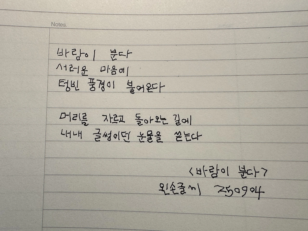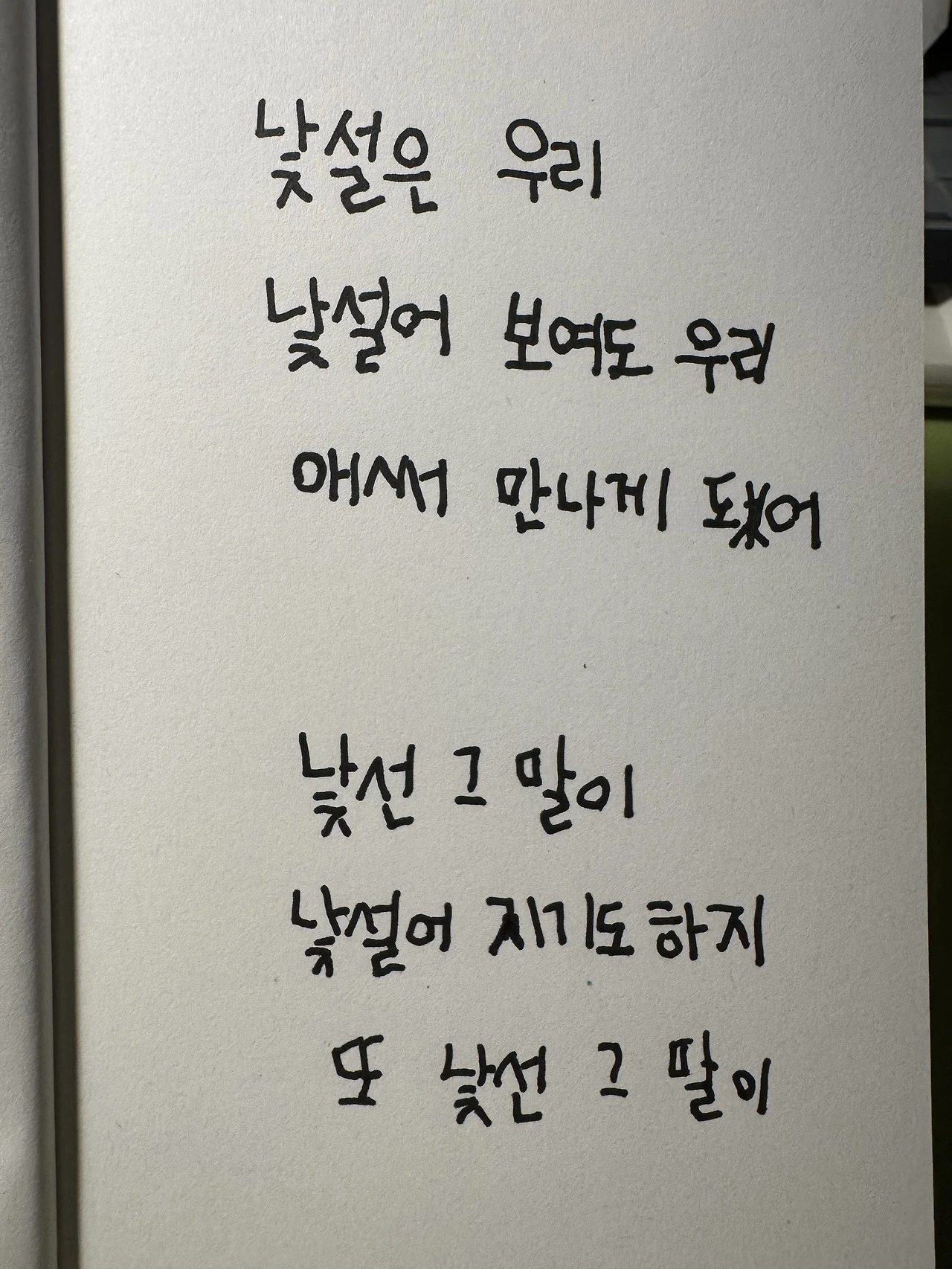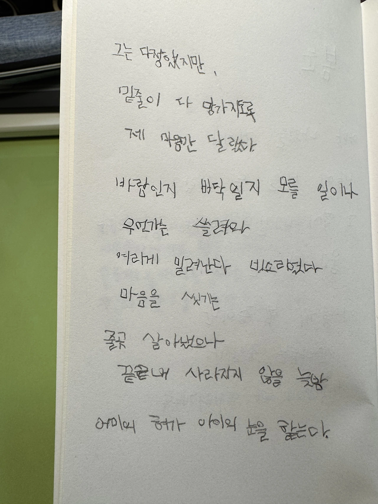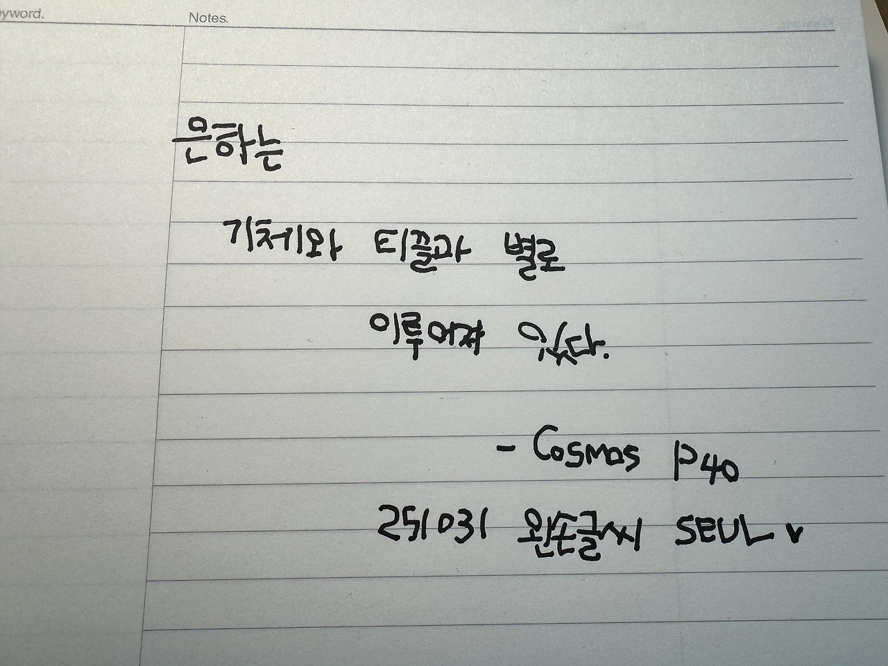 삐뚤빼뚤 나의 왼손 글씨는 가지런하진 않지만 꽤 귀엽다. 자음까지는 어찌 잘 써지다가 모음에서 작대기는 갈피를 잡지 못한다. 모음의 작대기가 쭈욱 하고 미끄러지듯 삐뚤어지면 다음 작대기에서 나는 노트를 이리저리 움직여본다.