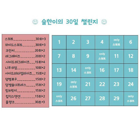 처음에는 인터넷에 떠도는 <30일 챌린지>로 시작했다. 하루하루 해나가는 재미가 있었다. 다 끝나고 난 후에 <나만의 30일 챌린지>를 만들어서 참 열심히 운동했다. 지금은 걷거나 실내 사이클 타기만 하고 있는데, 이번 생리가 끝나면 다시 시작할 생각이다.