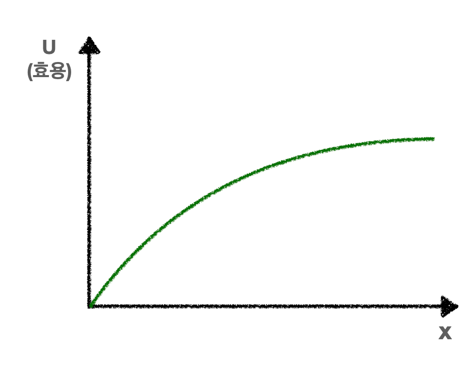 따라서 효용 함수의 그래프는 x축에 소비하는 재화의 양이, y축에 효용이 위치하며, 일반적으로 다음과 같은 형태입니다. 재화 x의 소비량이 한 단위 늘어남에 따라 효용이 체감적으로 증가하는 형태이죠.