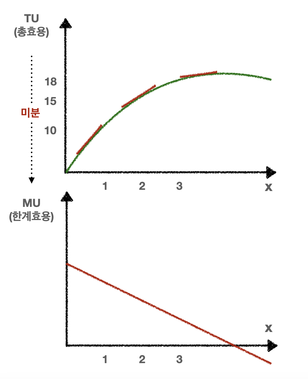 한 발 더 나아가 봅시다. 한계 효용은 추가적으로 증가하는 효용을 뜻하므로, 경제학에서는 이를 총효용의 변화량으로 표현할 수 있습니다. 어떤 함수의 변화량을 구하기 위해 우리는 기울기를 측정하거나, 특정 지점에서의 순간적인 기울기인 미분을 사용합니다.