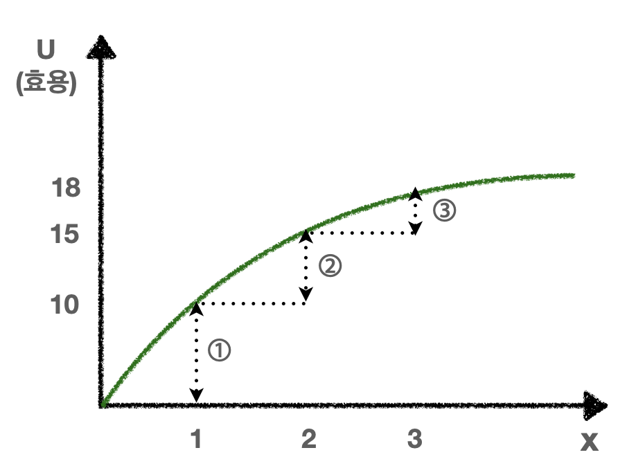 이것이 바로 효용이 체감(-)적으로 증가(+)한다는 말의 의미입니다. 재화 x의 소비량이 한 단위 늘어남에 따라 효용이 증가하되, 그 증가폭이 점점 줄어든다는 것이죠.