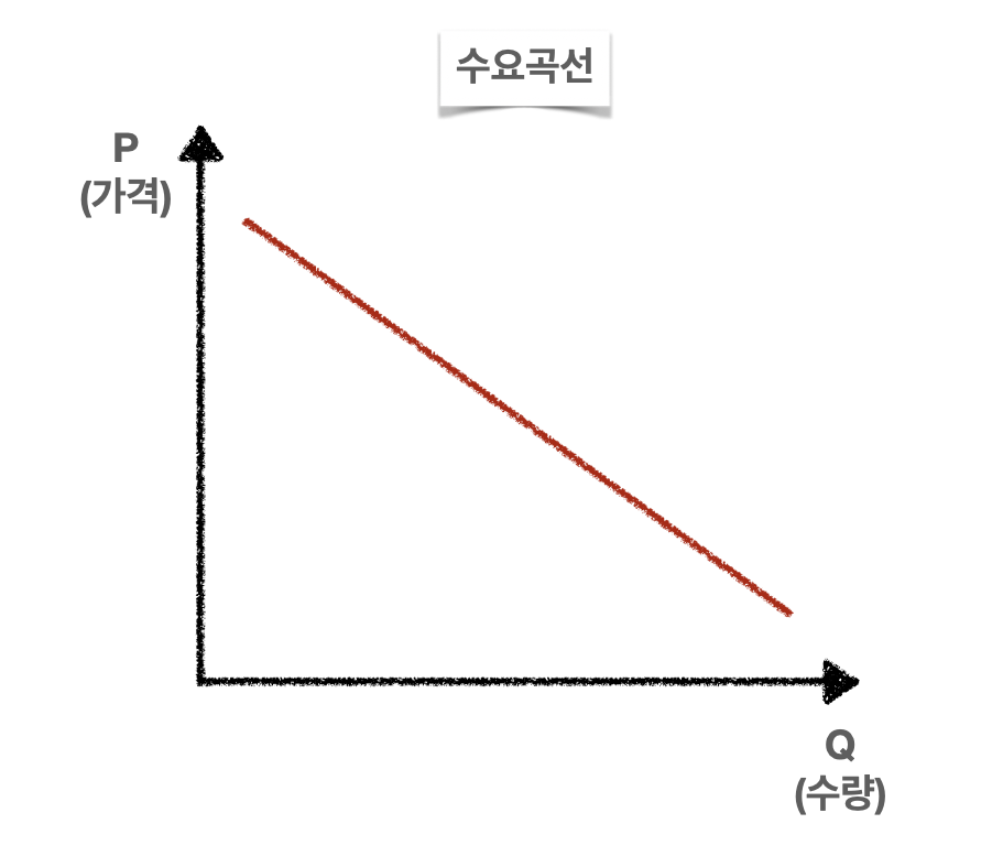 소비자는 가격과 효용을 고려해 적절한 수준에서 소비를 결정하게 됩니다. 그러나 소비량이 늘어날수록 추가적인 한 단위에서 얻는 만족감은 점점 줄어들기 때문에, 가격이 더 낮아져야만 만족감이 덜한 추가 단위를 구매할 유인이 생기죠. 이처럼 소비량이 증가함에 따라 소비자가 기꺼이 지불하려는 가격이 낮아지기 때문에, 수요곡선은 우하향하는 형태를 띄게 됩니다.