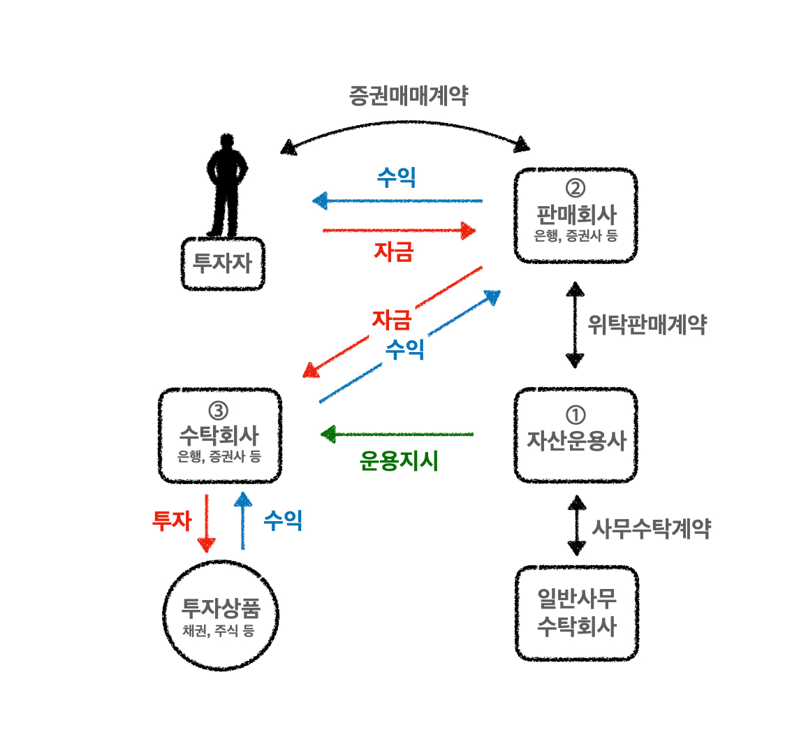 펀드가 어떠한 방식으로 운용되는지 조금 더 자세히 살펴보자. 펀드의 운용에는 다음과 같은 다양한 회사들이 관여한다.