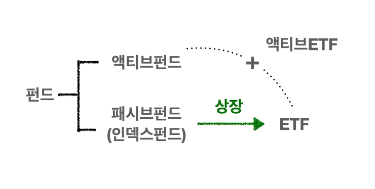 펀드는 크게 인덱스펀드(Index Fund)와 액티브펀드(Active Fund)로 나눌 수 있다. 인덱스펀드는 인덱스, 즉 지수를 추종하여 해당 지수와 동일한 수익률을 얻는 것을 목표로 하는 소극적(passive) 펀드이고, 액티브펀드는 펀드매니저가 평균 이상의 수익률을 얻기 위해 적극적인 노력을 하는 펀드이다.