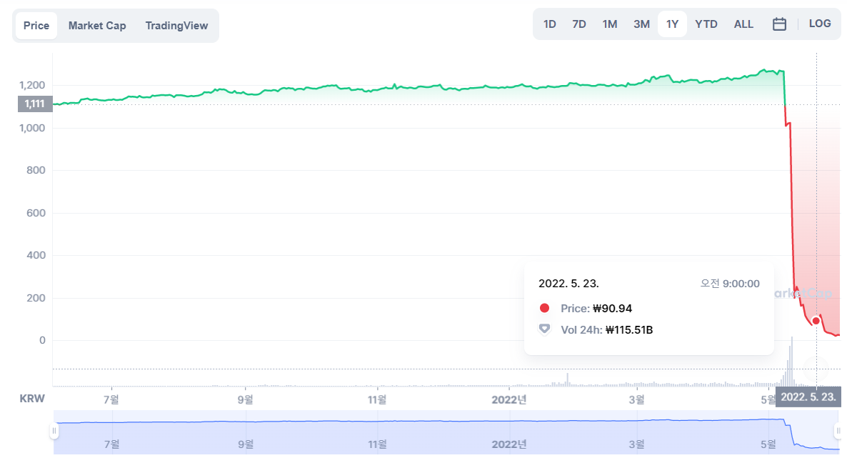 1달러를 유지해야하는 UST는 순식간에 0.18달러까지 하락했고, '안정적인(stable)' 코인이라는 이름이 무색하게도 테라는 고점 대비 -57%, 루나는 고점 대비 -99% 하락이라는 최악의 상황을 맞이하게 된다.